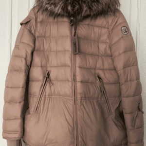 Edel schimmernde Steppjacke mit abnehmbarer Kapuze und Webpelz in mauve