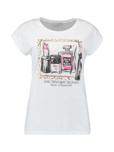 Das Rundhalsshirt mit angesagtem Glitterprint vorn hat einen lässigen Schnitt, kurze Ärmel und die Baumwollmischung garantiert ein bequemes und leichtes Tragegefühl.