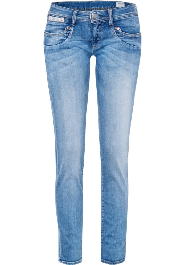 Stretch jeans with shaped waistband, curved double saddle at the back, side seam running to the back