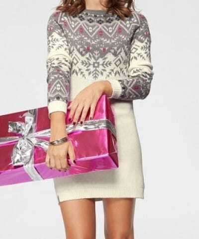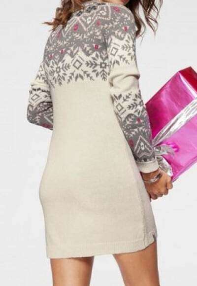 Der halsnahe Rundhalsausschnitt und die klassischen Rippstrickbündchen passen sich gelungen in das Design des Pulloverkleids ein.