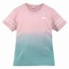 A beautiful girls' T-shirt from Kangaroos in a dip-dye look with narrow contrasting stripes on the sleeves, a large print on the back and a small brand print on the front.