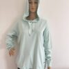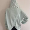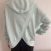 Von Vorn schaut es wie ein ganz normales Kapuzenshirt aus, während sich auf der Rückseite ein extravaganter Rückenausschnitt in Wickeloptik präsentiert.