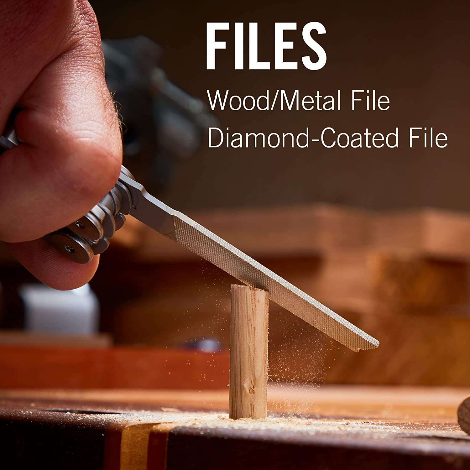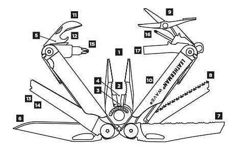 MANY FUNCTIONS: Various pliers, interchangeable wire cutters, a wire stripper, knife, saw, scissors, ruler, can and bottle opener, file and screwdriver.