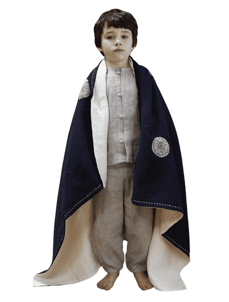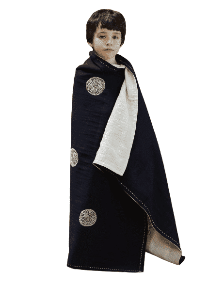 The Yume children's blankets are made of multi-layered fabrics and are handmade and embroidered by women in time-consuming homework. The embroideries symbolize elements from nature for which the embroiderers (inside) are important: Suns, moons, rain, rice.