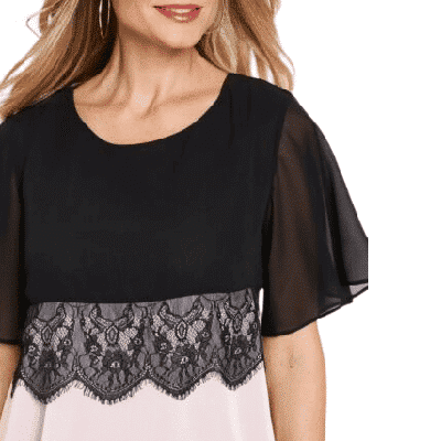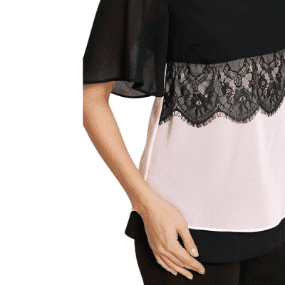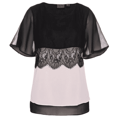 La blusa camisera con encaje de bpc selection atrae todas las miradas gracias a su elegante doble aspecto. El corte recto, ligeramente ceñido a la figura y con escote redondo, resulta especialmente elegante gracias a la fluidez del tejido. El amplio ribete de encaje en la parte delantera por debajo del pecho es un detalle decorativo. El diseño de alto contraste le da un toque exclusivo. Las mangas cortas y anchas y el bajo alargado de tejido transparente acentúan su atractivo.