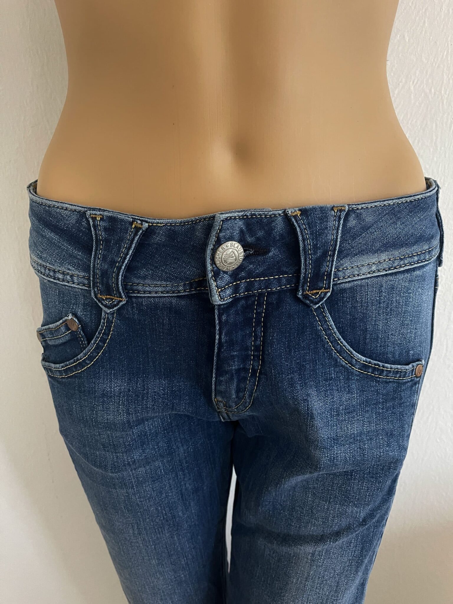 Sie kommt in schmaler Passform mit normaler Leibhöhe.