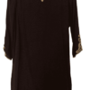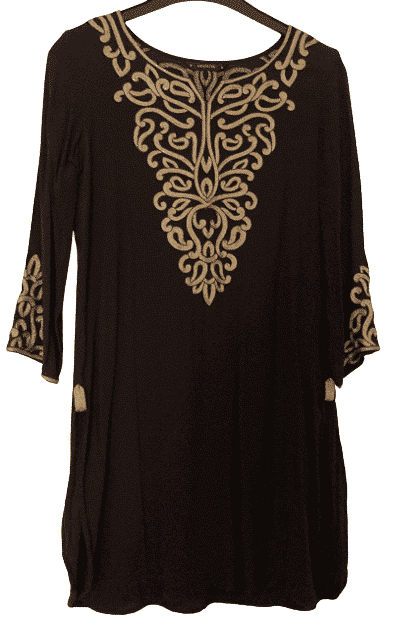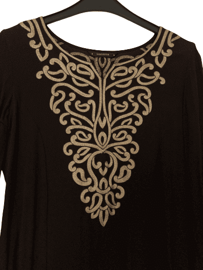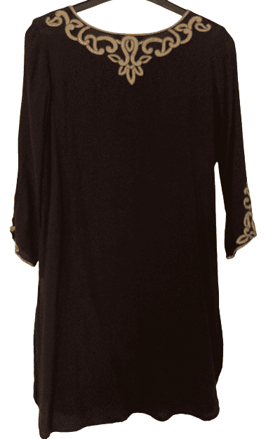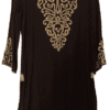 La blusa larga lleva bordados dorados en la parte delantera, a lo largo del escote y en las mangas.
