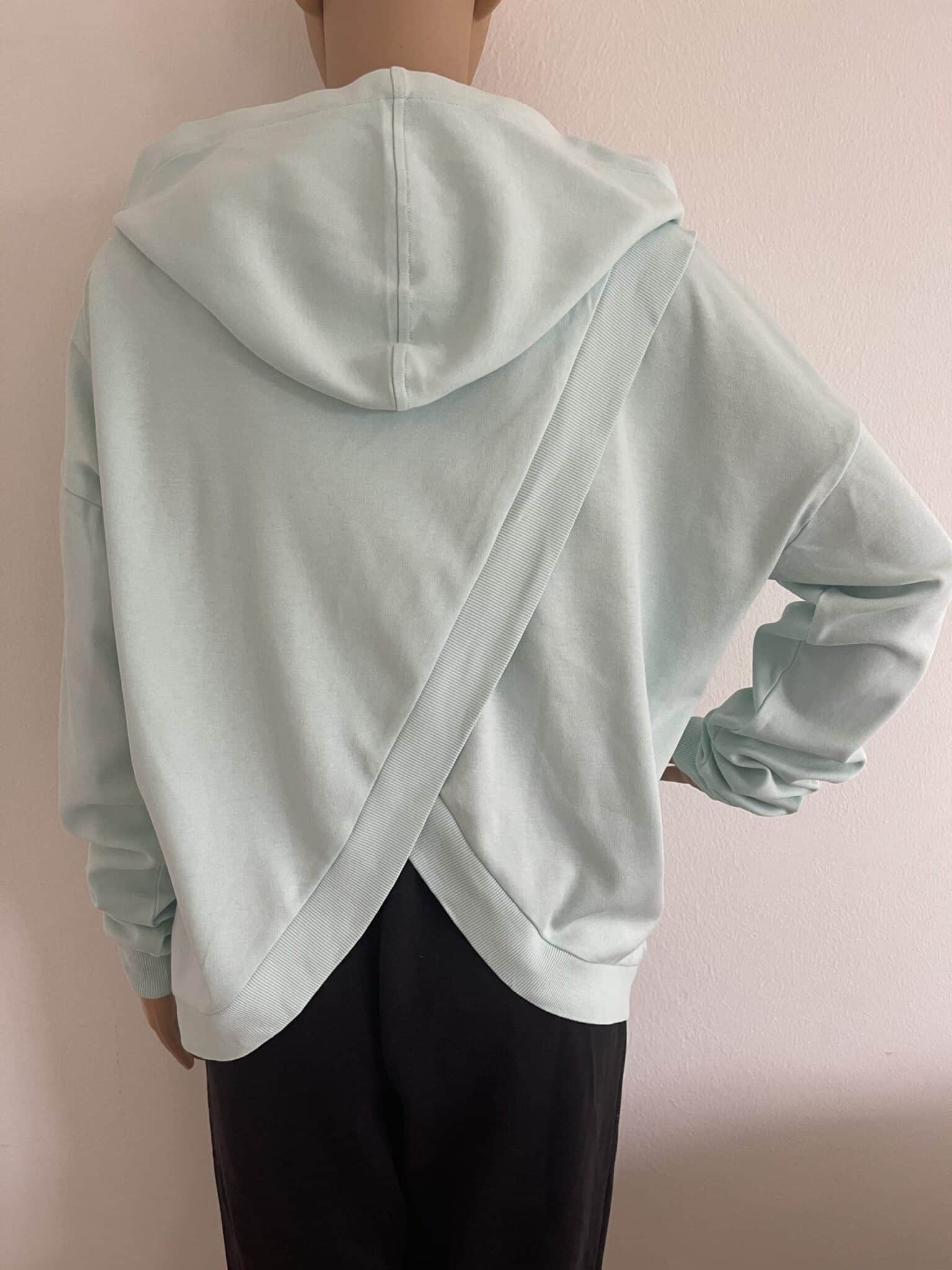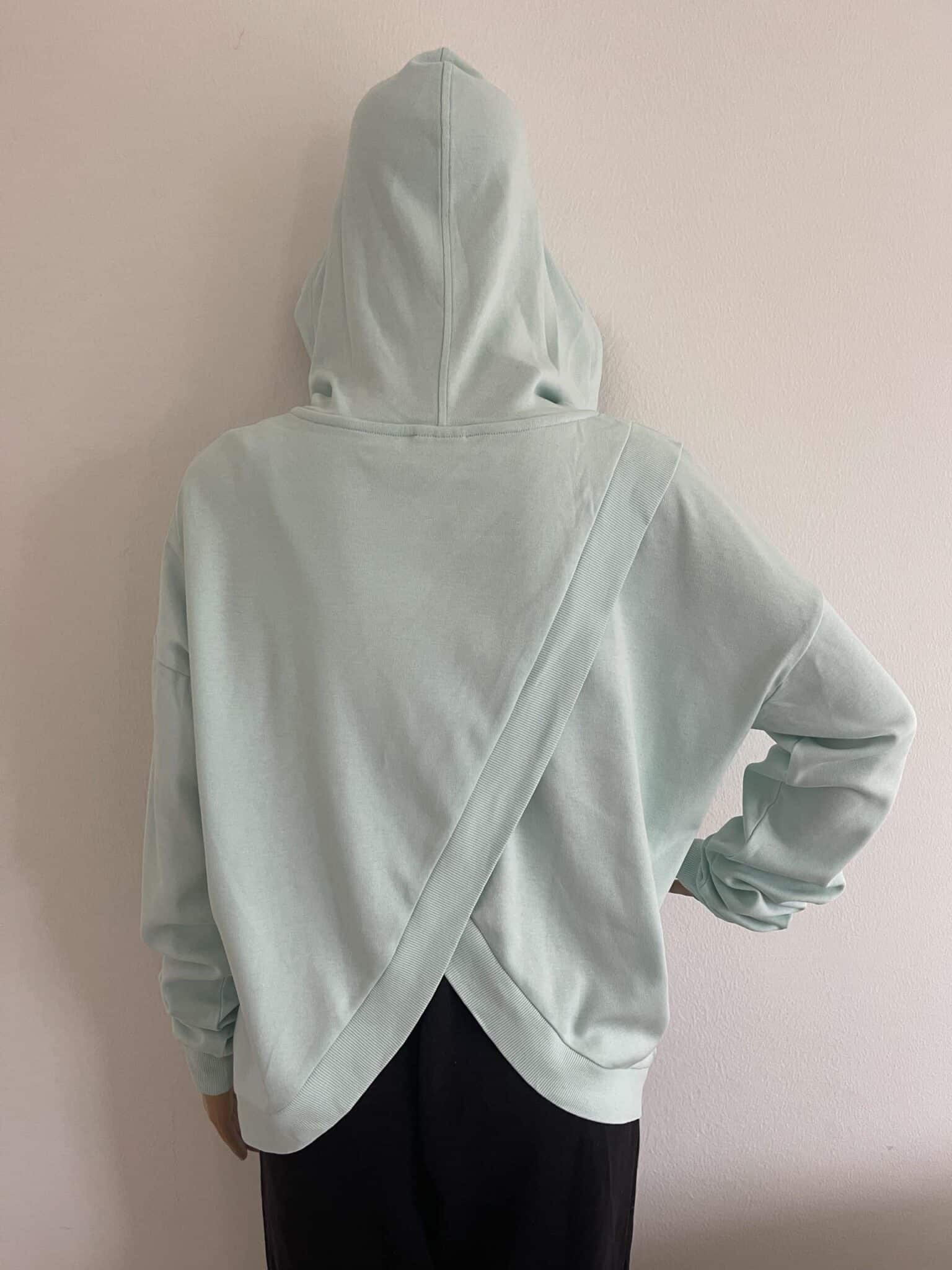 Von Vorn schaut es wie ein ganz normales Kapuzenshirt aus, während sich auf der Rückseite ein extravaganter Rückenausschnitt in Wickeloptik präsentiert.