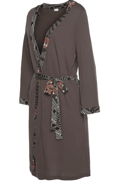 Der locker geschnittene Kimono ist einfarbig gehalten jedoch der Bindegürtel und die Saumabschlüsse sind im auffälligen Ethno Muster gestaltet.