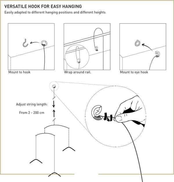 Jedes Mobile wird mit 2 m geflochtener Drahtschnur geliefert, die eine große Flexibilität bei der Aufhängung bietet und es Ihnen ermöglicht, die Aufhängehöhe mit Leichtigkeit auszuwählen und zu ändern