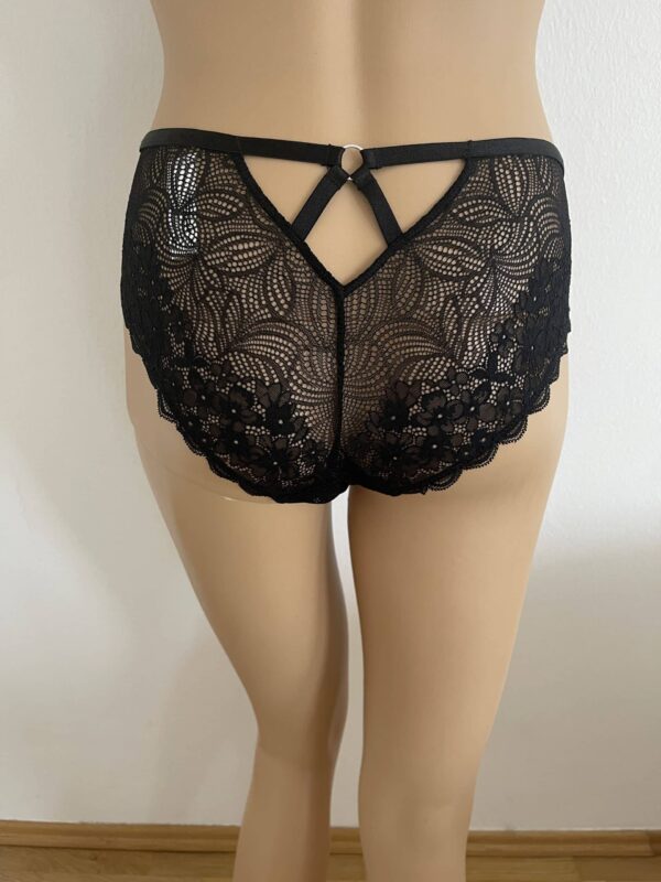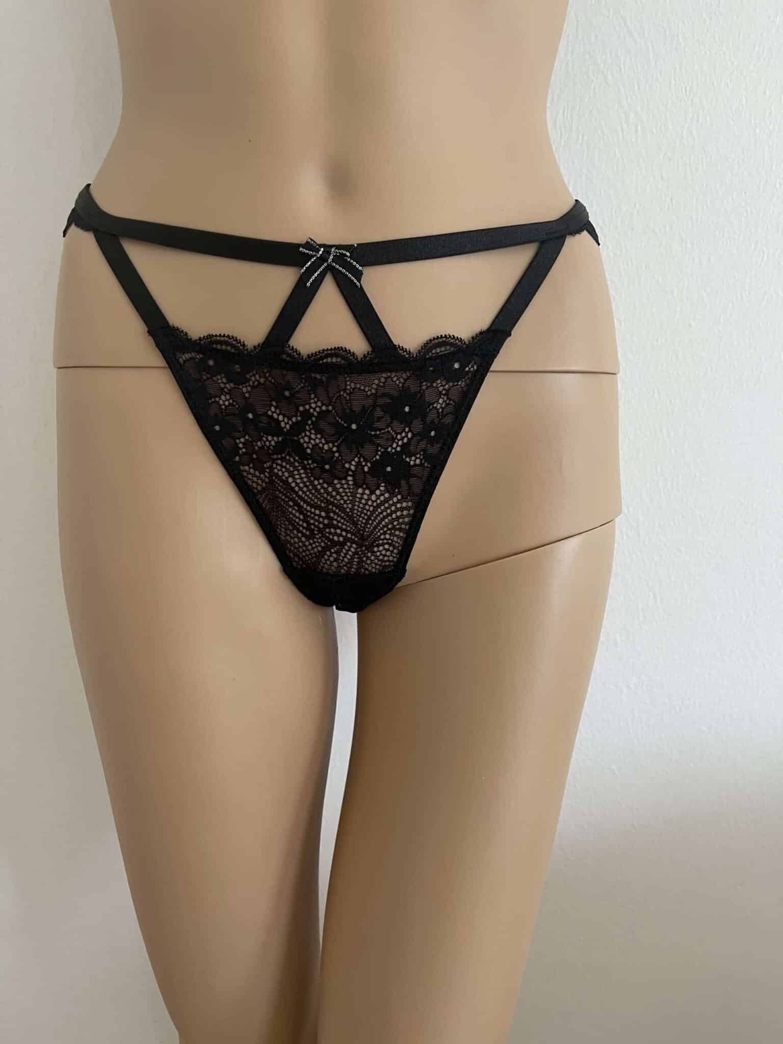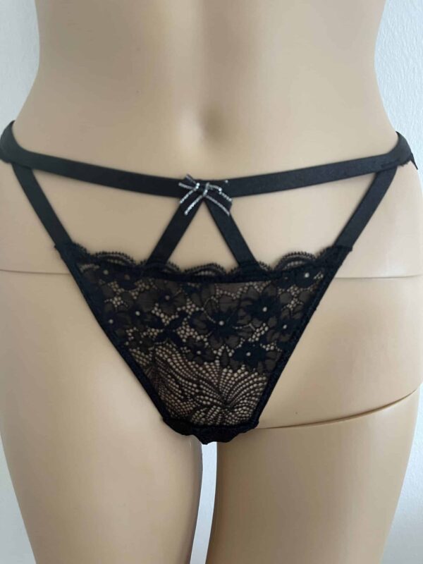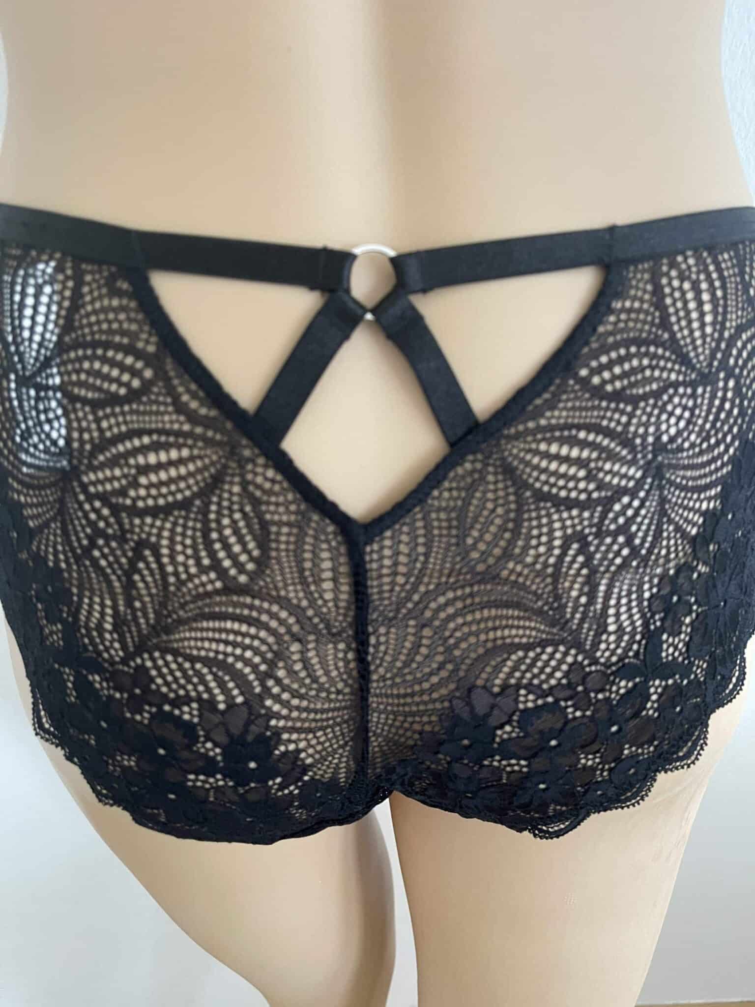 Der Slip von Petite Fleur besteht aus wunderschöner, leicht transparenter Spitze in floraler Optik. Der sexy Look bekommt er durch eine kleine Zierschleife vorne und einem Metallring in der hinteren Mitte in welchem die Bänder zusammen gehalten werden.