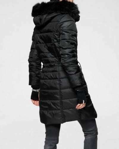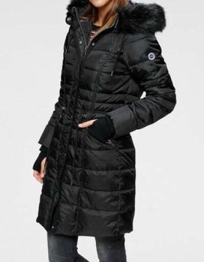 An der Kapuze sitzt eine kuschelige Borte aus Fake Fur und durch variable Tunnelzugbänder lassen sich Kragen und Taille nach Belieben variieren.