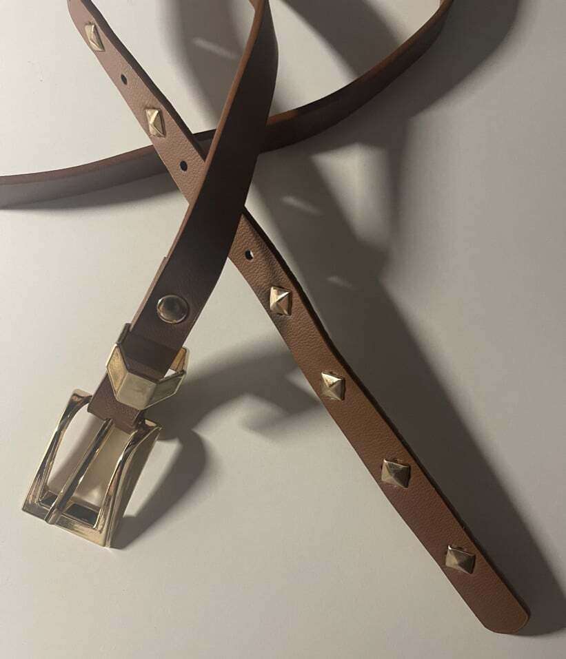 Schmaler Damengürtel mit goldfarbiger Dornschnalle & passender Schlaufe. Goldfarbige Nieten machen aus dem süßen Gürtel einen Trendsetter.