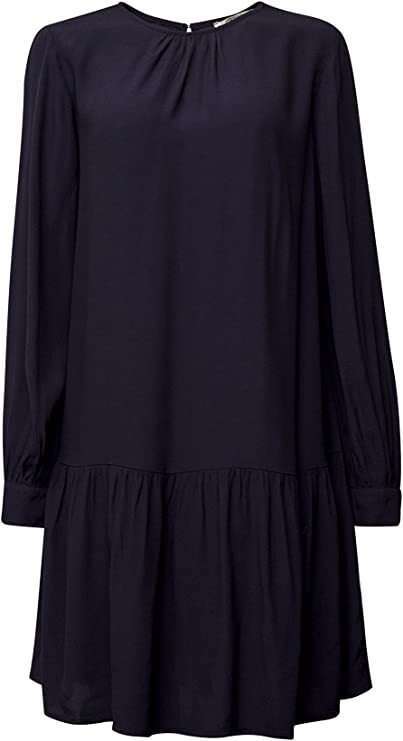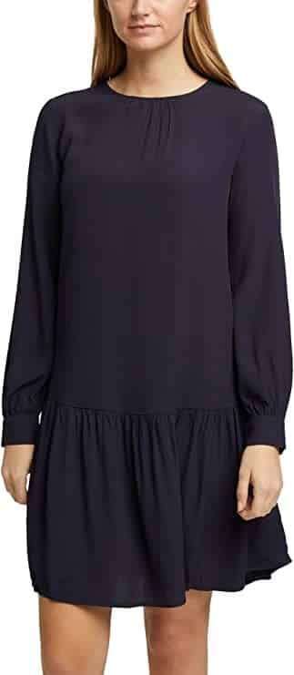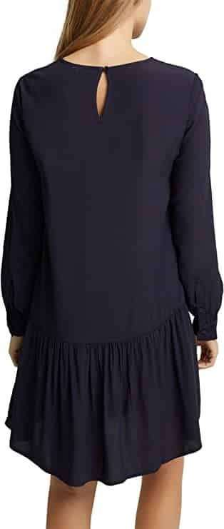 Das Kleid weist einen Rundhalsausschnitt auf, ist auf der Vorderseite drapiert und hat einen angesetzten Volant.