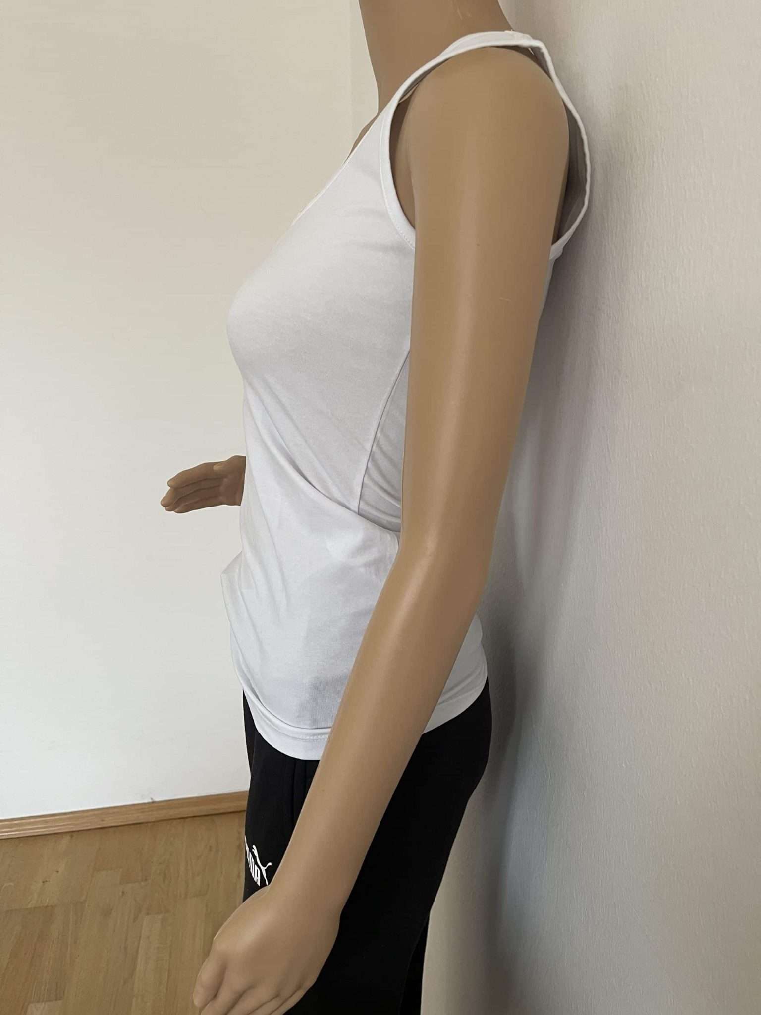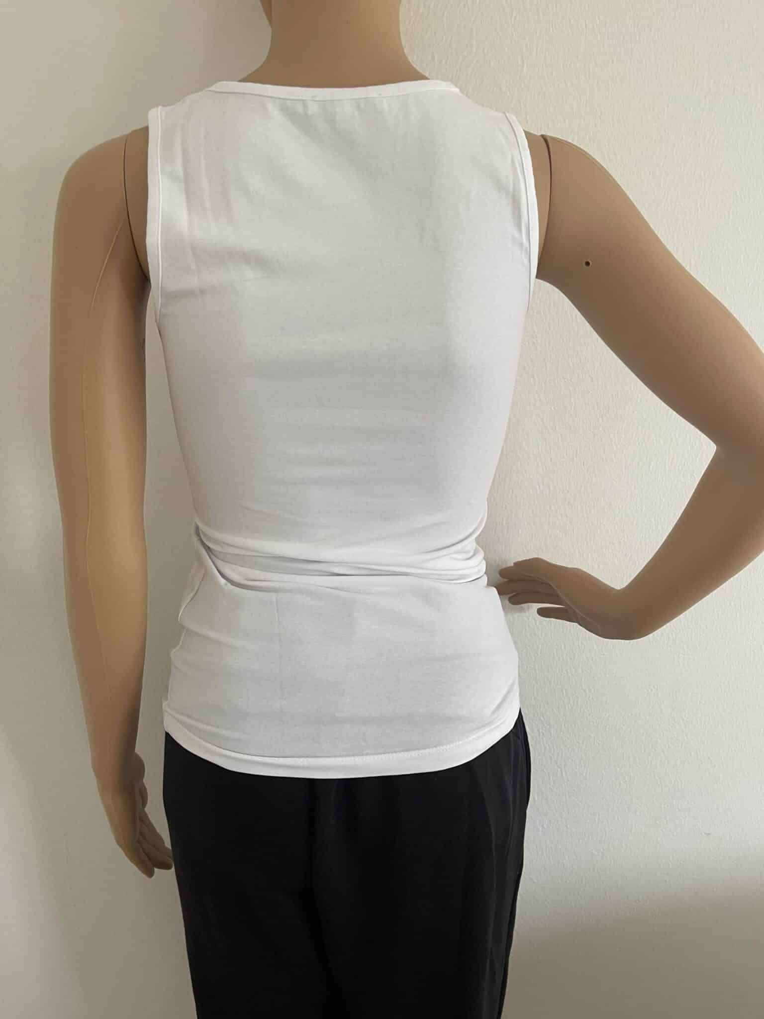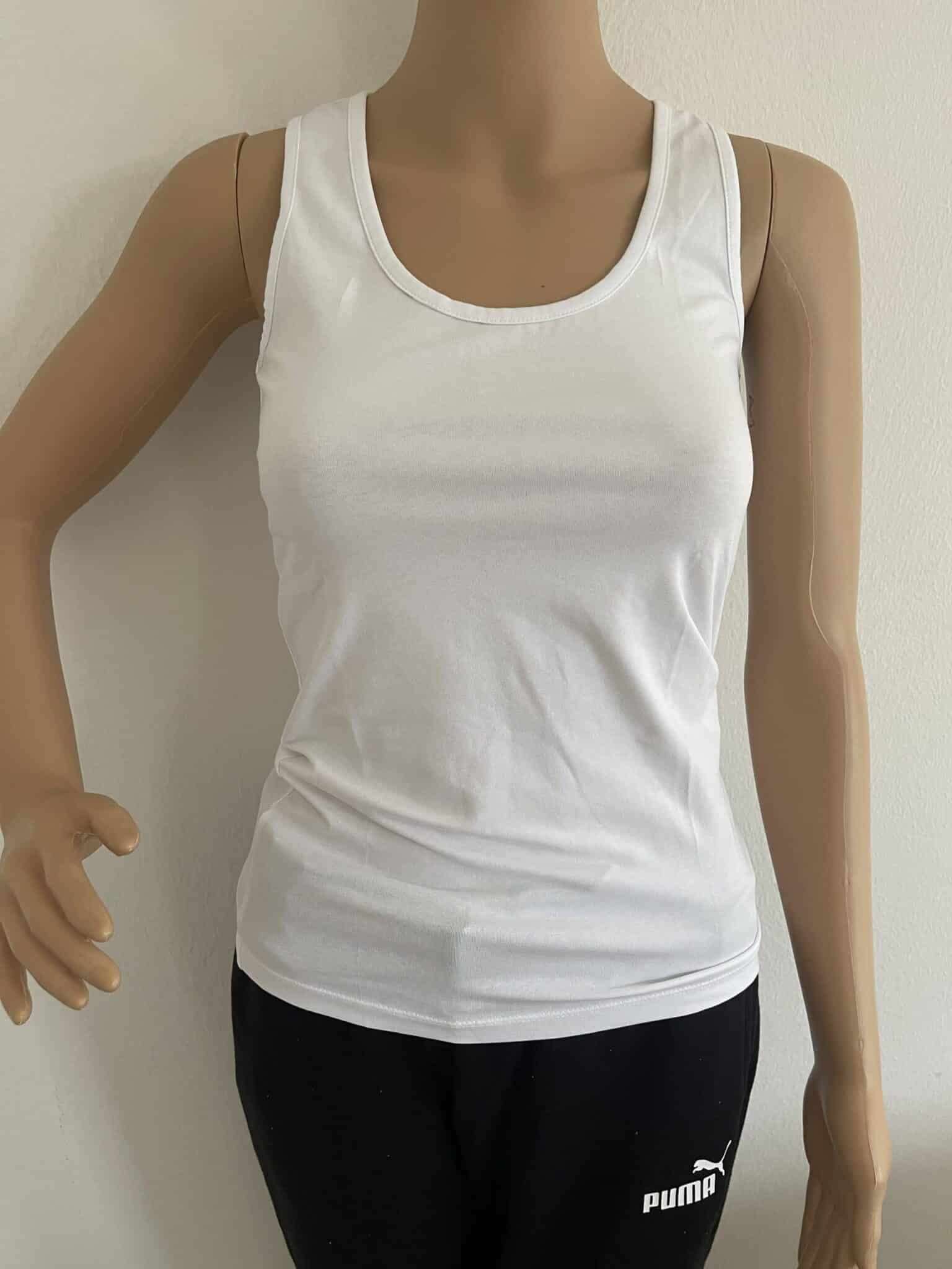 Canotta basic in cotone con elastan, tinta unita, senza colletto, lunghezza regolare, vestibilità aderente.