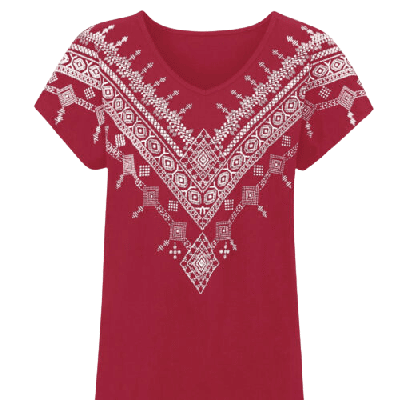 Shirt mit platziertem Druckmuster. V-Ausschnitt und überschnittene Schultern.