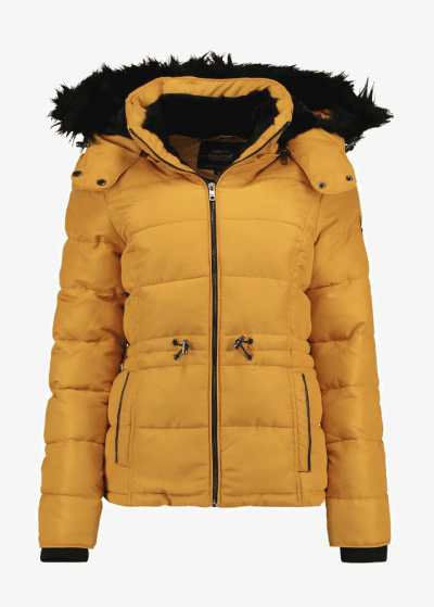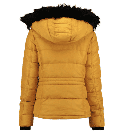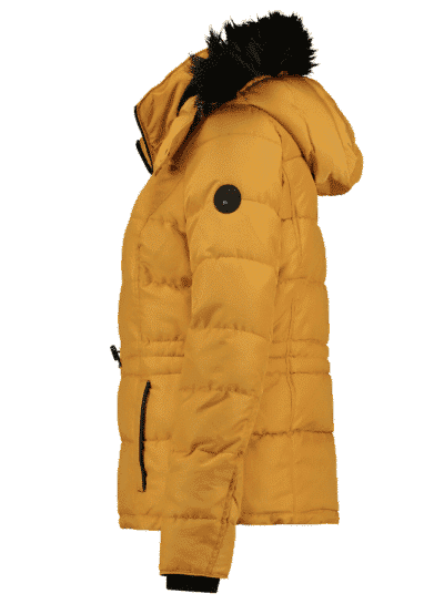 Steppjacke Amber mit farblich abgesetzen Kunstfell gefüttert, sowie im Kragen und an der Kapuze.