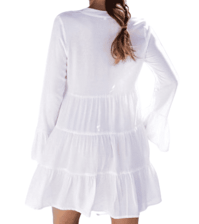 Die Ärmel und das gestufte Rockteil sind leicht ausgestellt, die weiche, gewebte Viskose gewährleistet einen hohen Tragekomfort der legeren Longbluse.