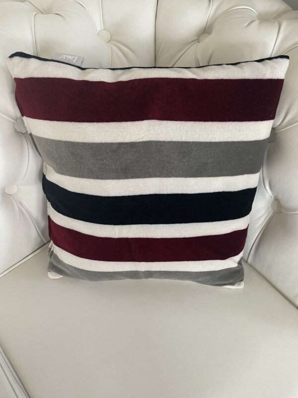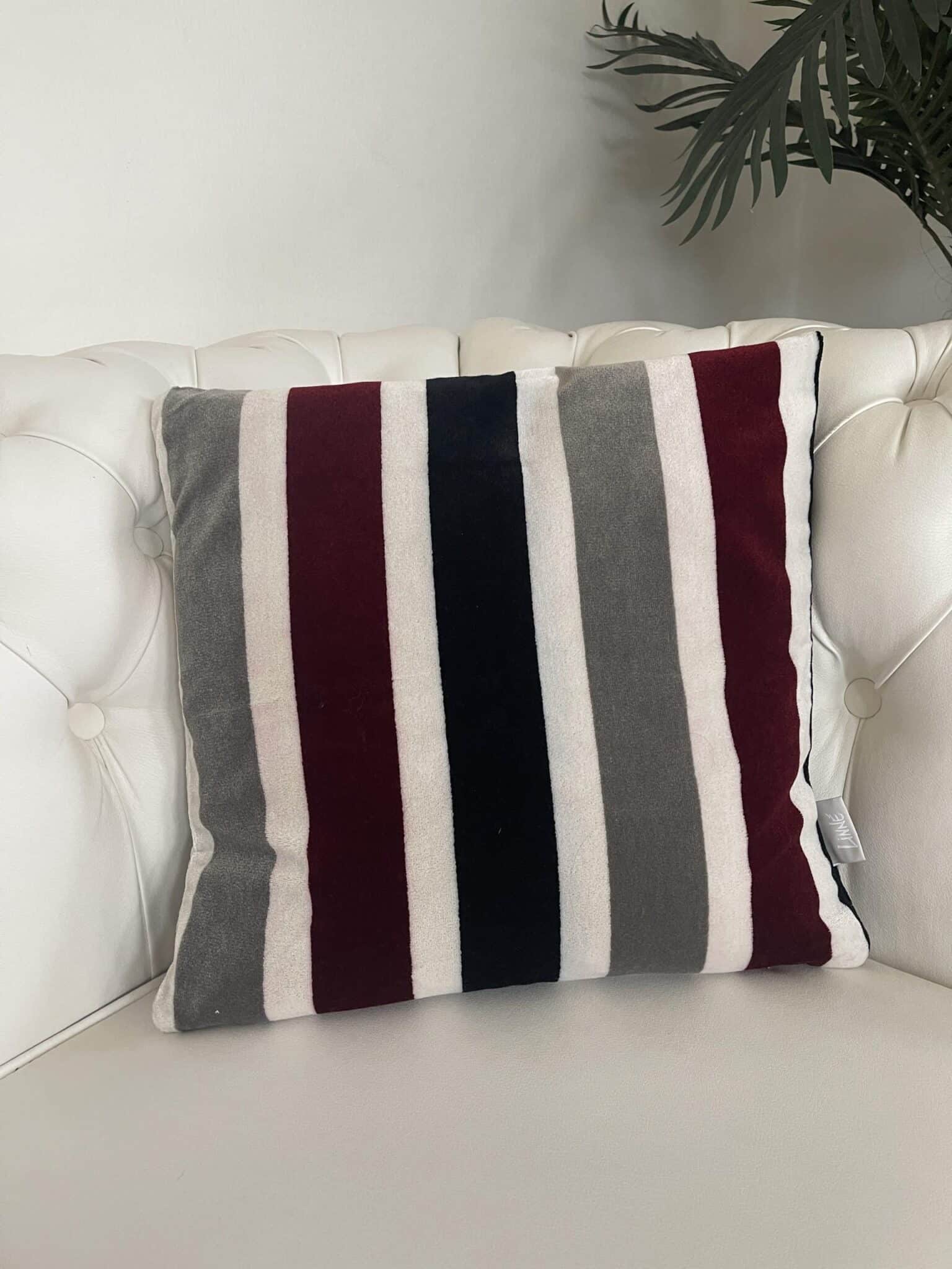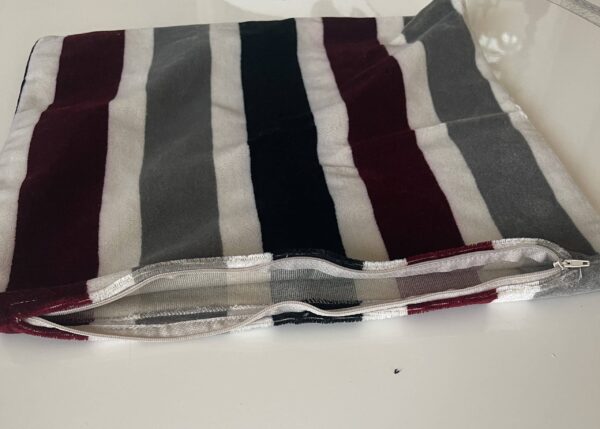 Die Kissenhülle ist mehrfarbig gestreift, in einer praktischen Größe von 40 x 40 cm und wird durch einen Reißverschluss geschlossen.