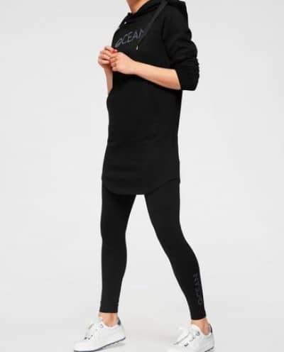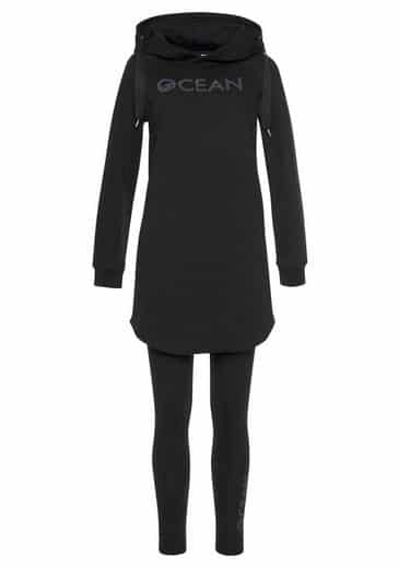 Composto da una felpa con cappuccio extra-long e da leggings in tessuto single jersey, questo comodo duo è un vero e proprio eye-catcher.