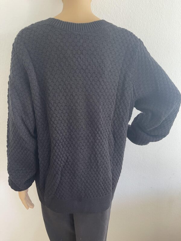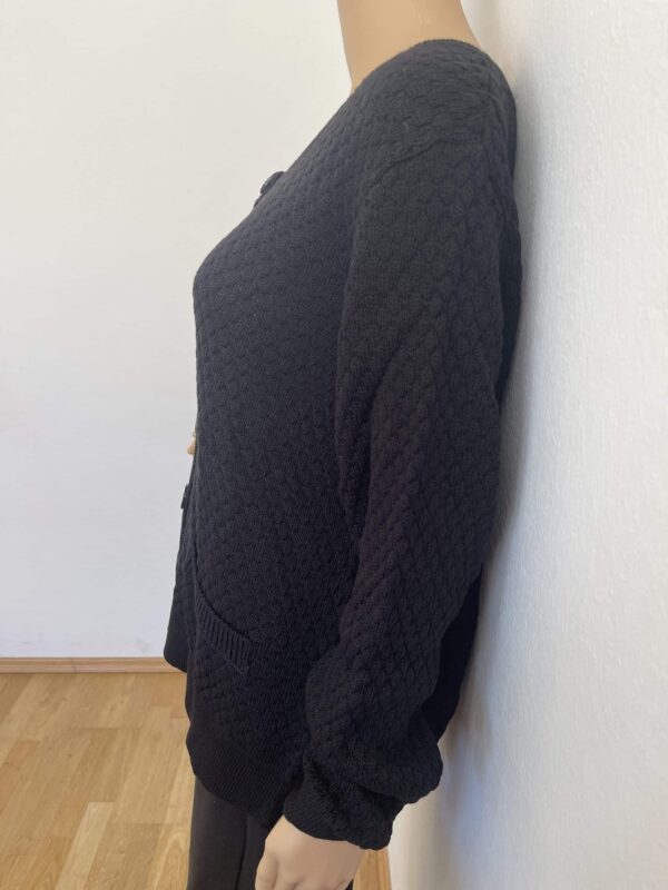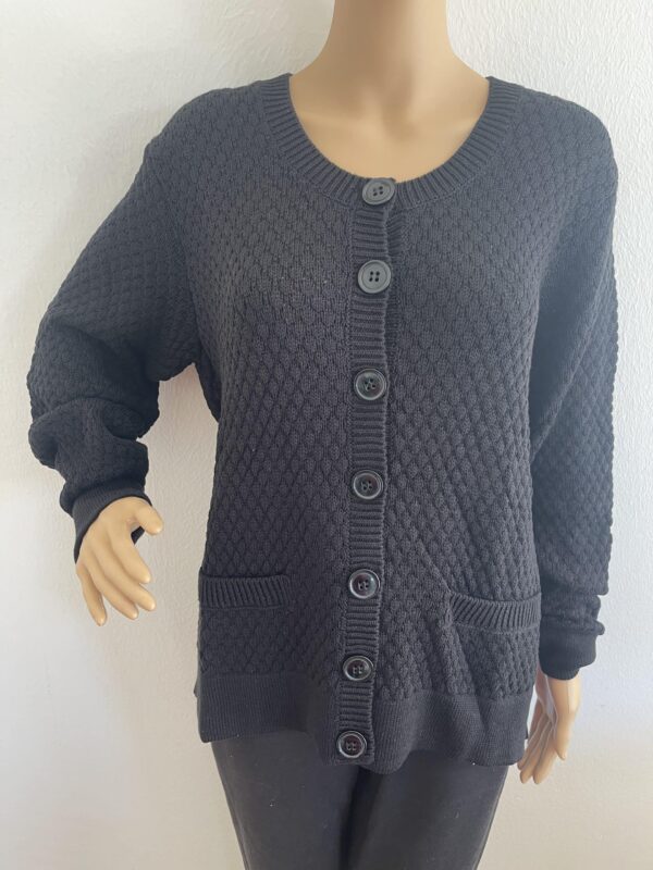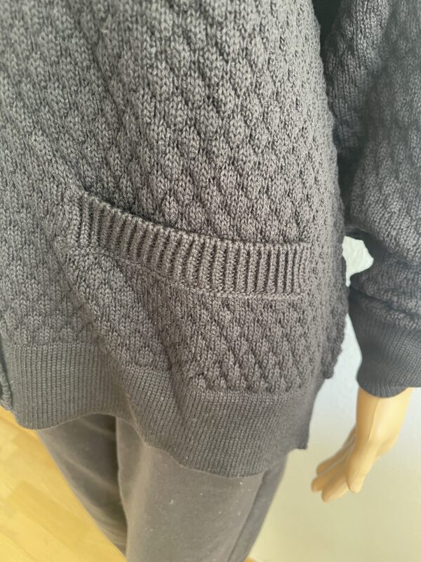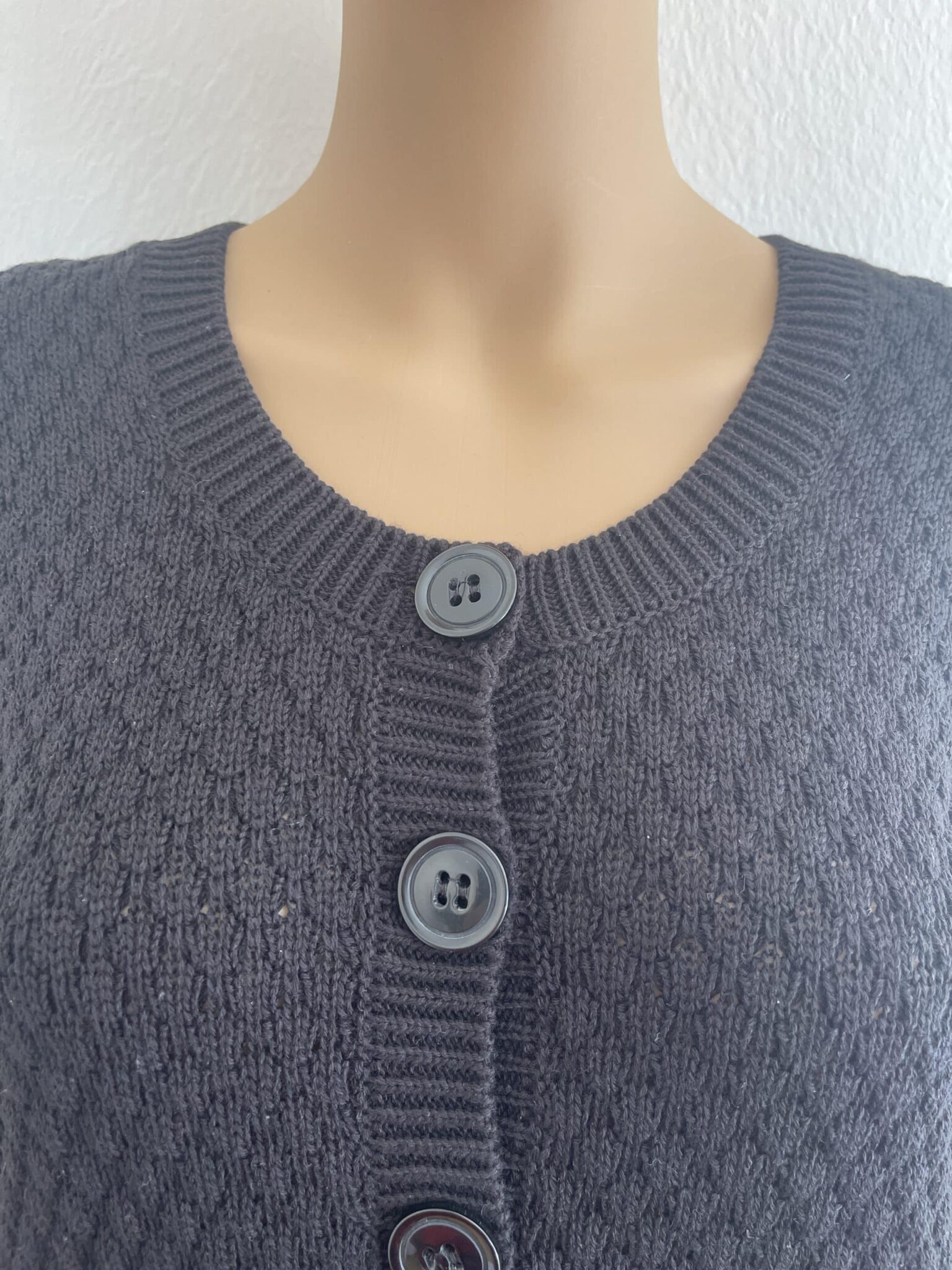Der Cadigan ,lässt sich mit großen Knöpfen verschließen.