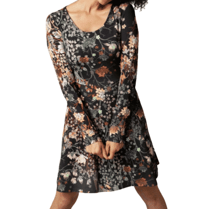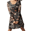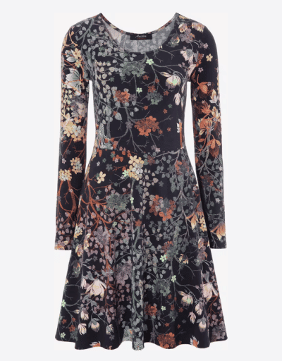De mini-jurk heeft lange mouwen en een ronde halslijn.