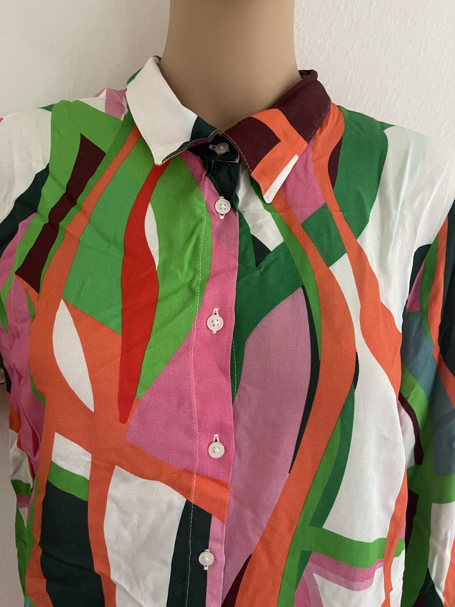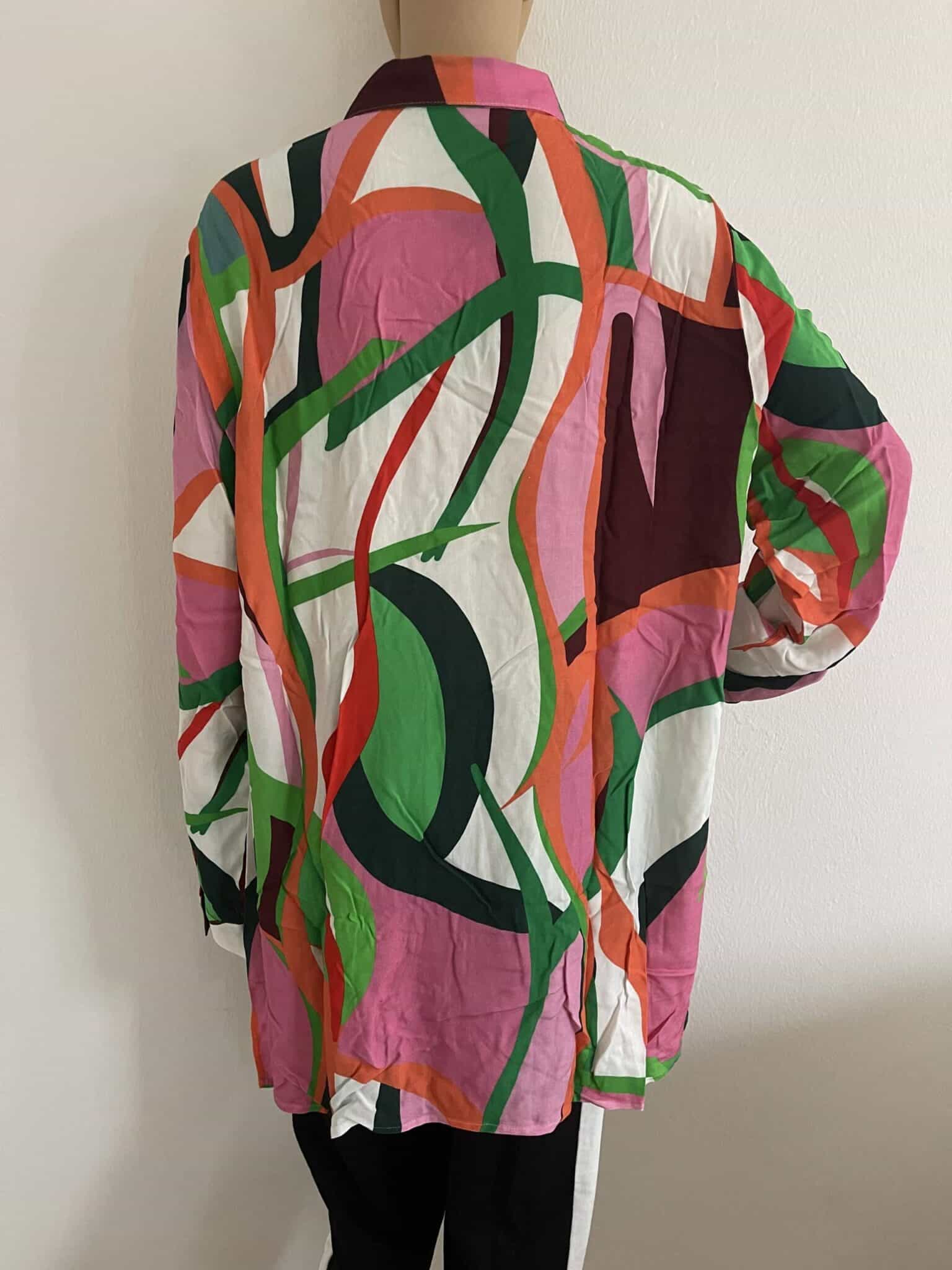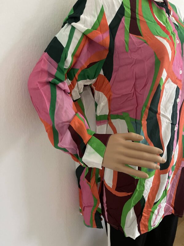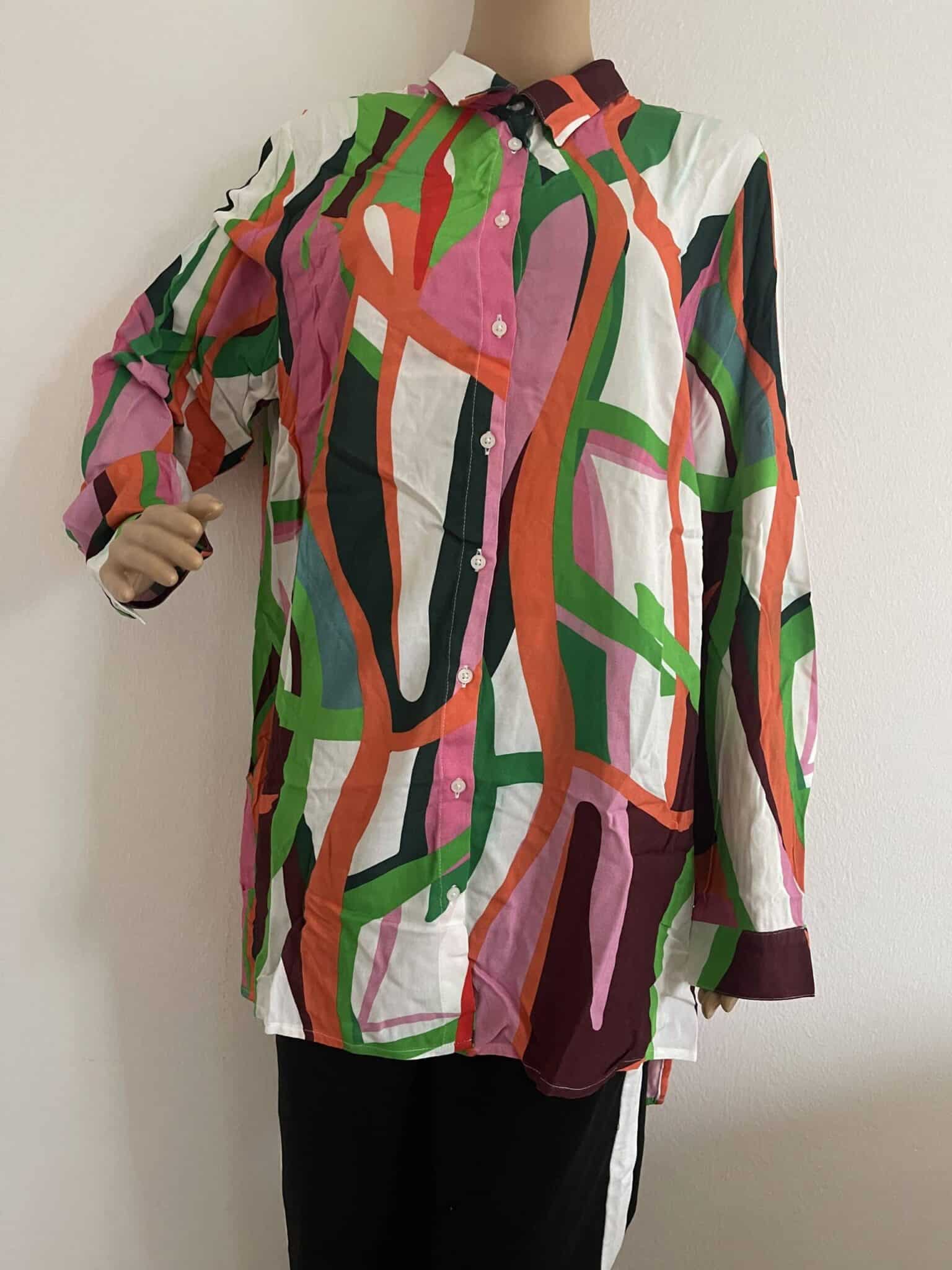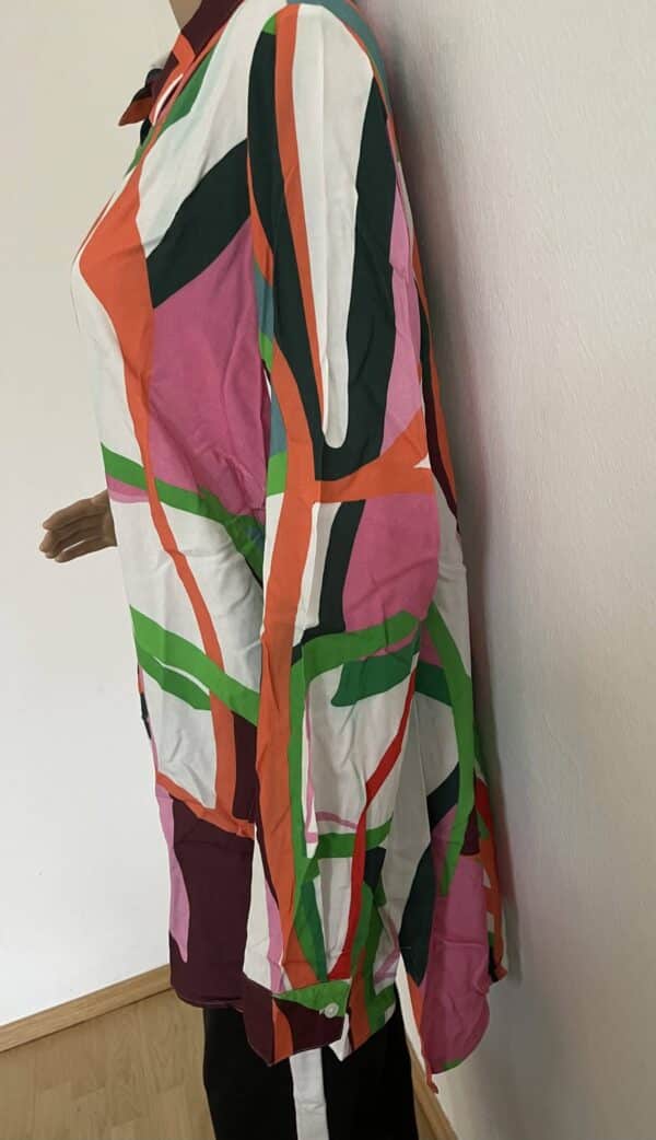 Farbintensiver, graphischer Druck. Mit Seitenschlitzen. Longform, durchgeknöpft und lange Ärmel mit Manschette. Lässig geschnittene Hemdbluse