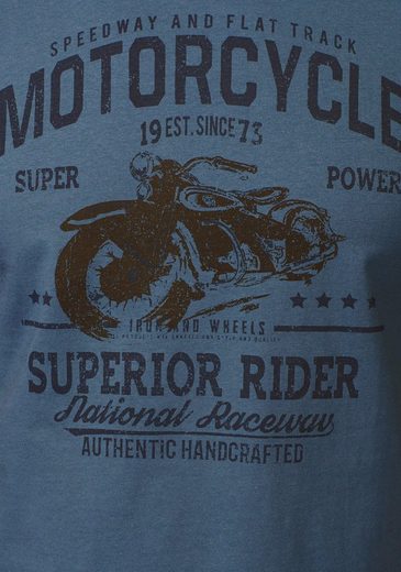 Der Frontprint mit Schriftzügen und Motorrad machen das klassische Rundhalsausschnitt Shirt zum locker-lässigen Begleiter, das aufgrund der trageangenehmen Baumwollqualität und dert bequemen Passform ein Begleiter für jeden Tag werden könnte.