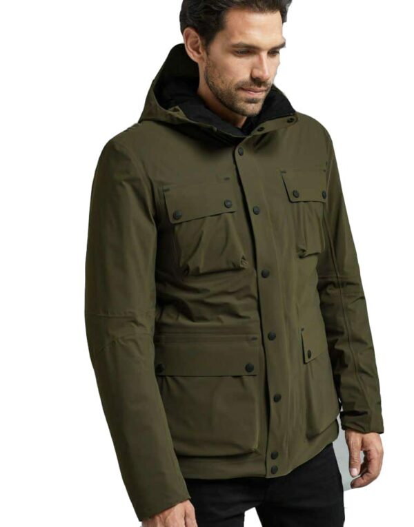 Deze versie van het klassieke vierzakkenontwerp in donker hickory is gemaakt van een waterdichte stof en gevuld met dons met heat mapping-technologie. De rigoureuze aandacht voor details omvat lasergesneden zakken, waterdichte heat-sealed naden en een geavanceerde binnenzak voor je smartphone met een transparant, touchpad-gevoelig schild.
