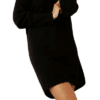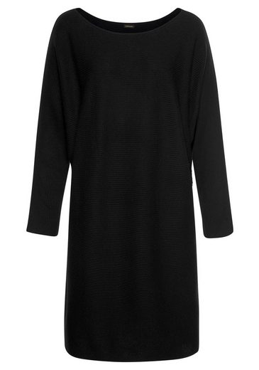 De rechte snit van de fijn gebreide jurk wordt charmant onderbroken door de wijde vleermuismouwen.