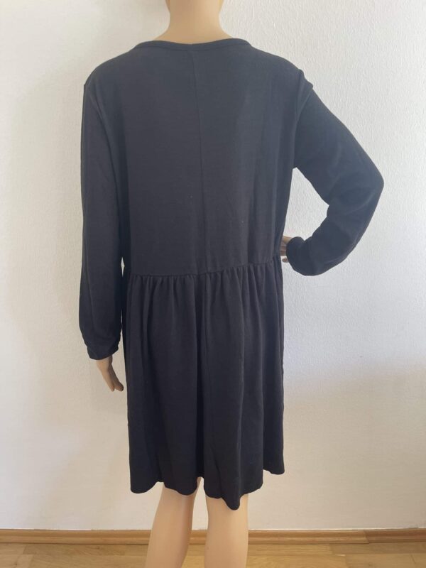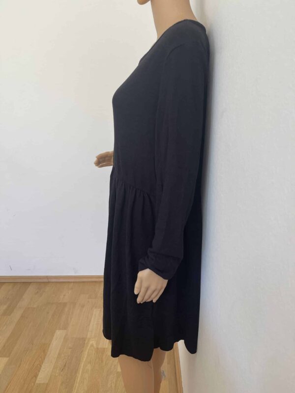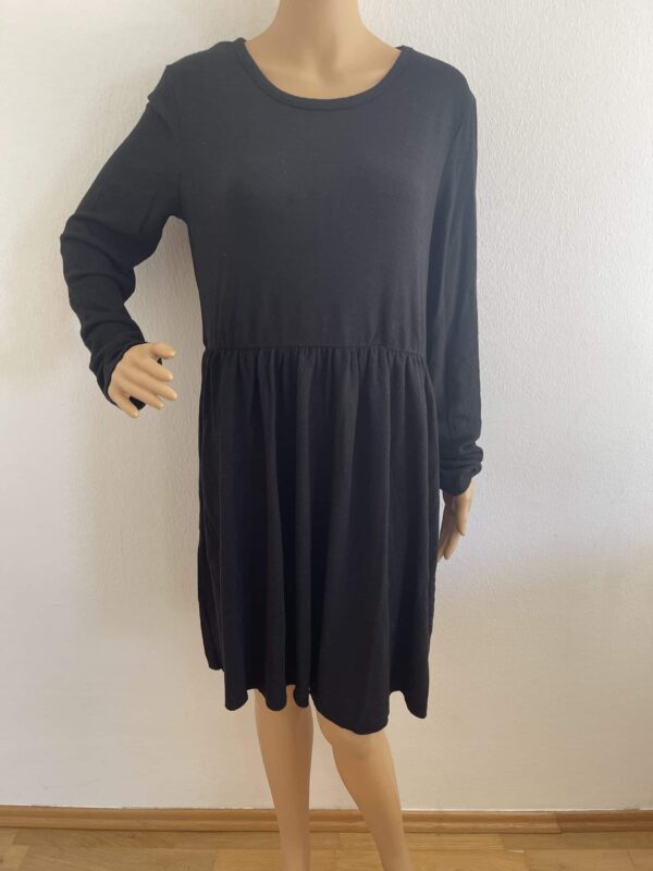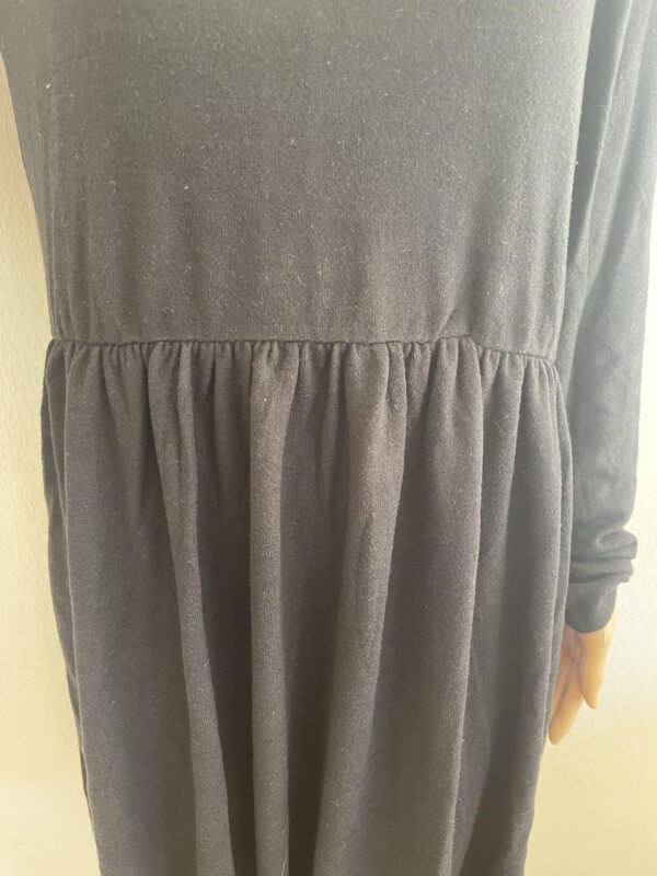 De jurk heeft een ronde hals, lange mouwen en een geplooide rok.