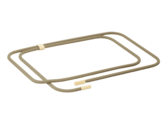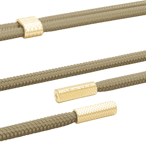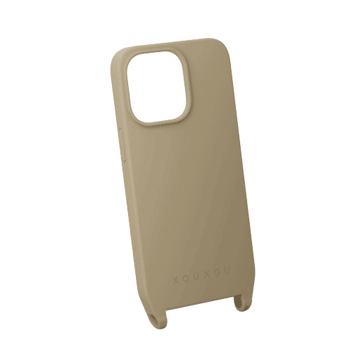 Ein rundes, geflochtenes Band in Taupe mit verstellbaren Klemmen und tauschbaren Endkappen in Hochglanz Gold, perfekt für eine XOUXOU Handyhülle.