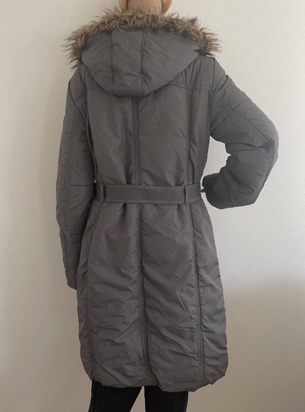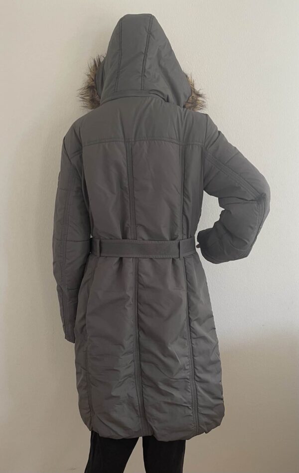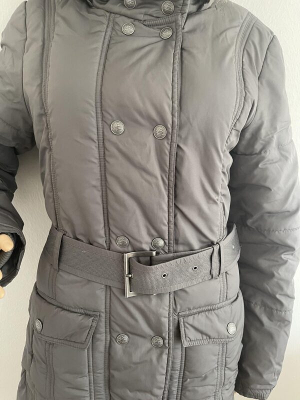 De afneembare capuchon en riem zijn de opvallende kenmerken van deze jas, die bijzonder praktisch is met zijn grote zakken.
