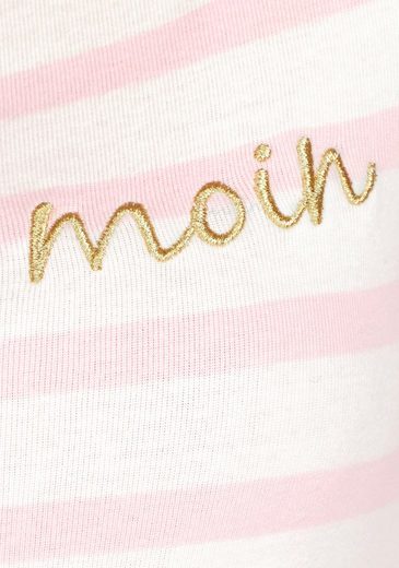 Goldfarbene Stickerei "Moin" in Brusthöhe