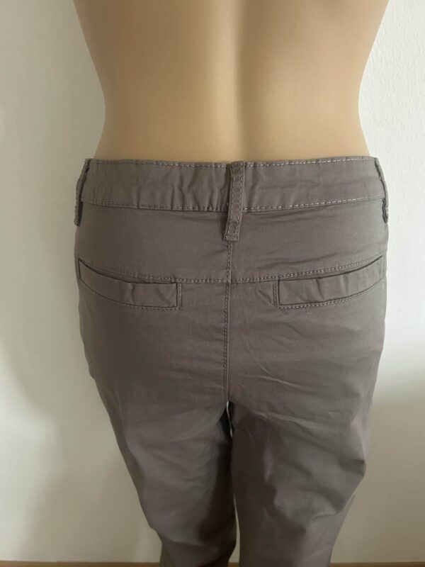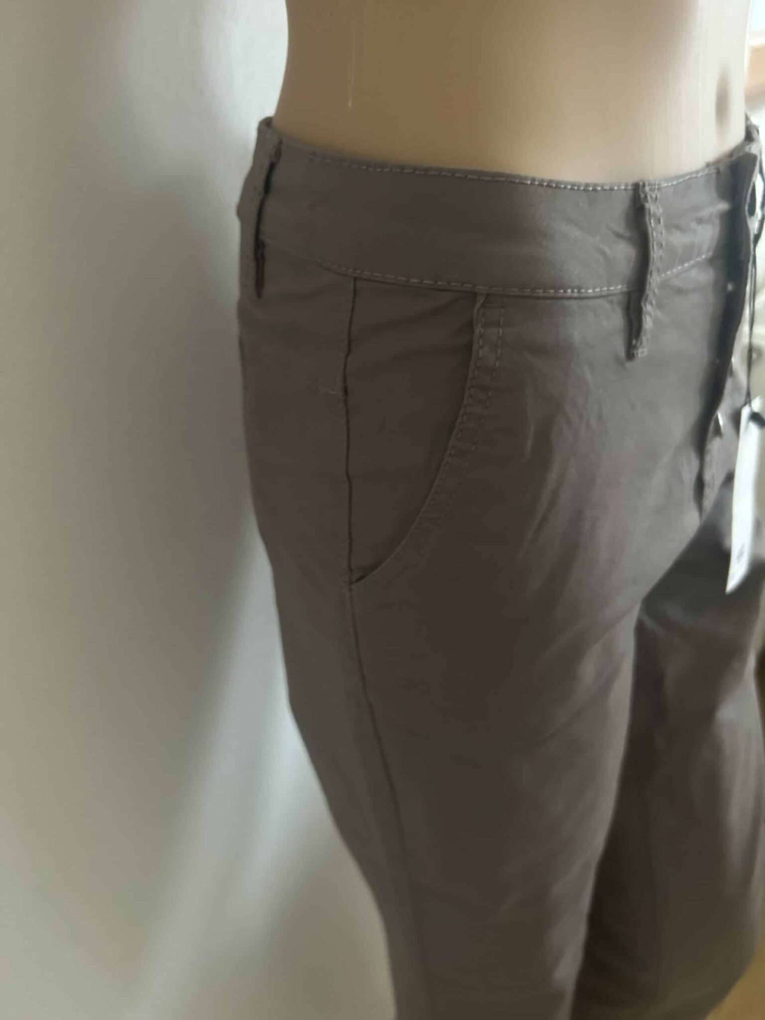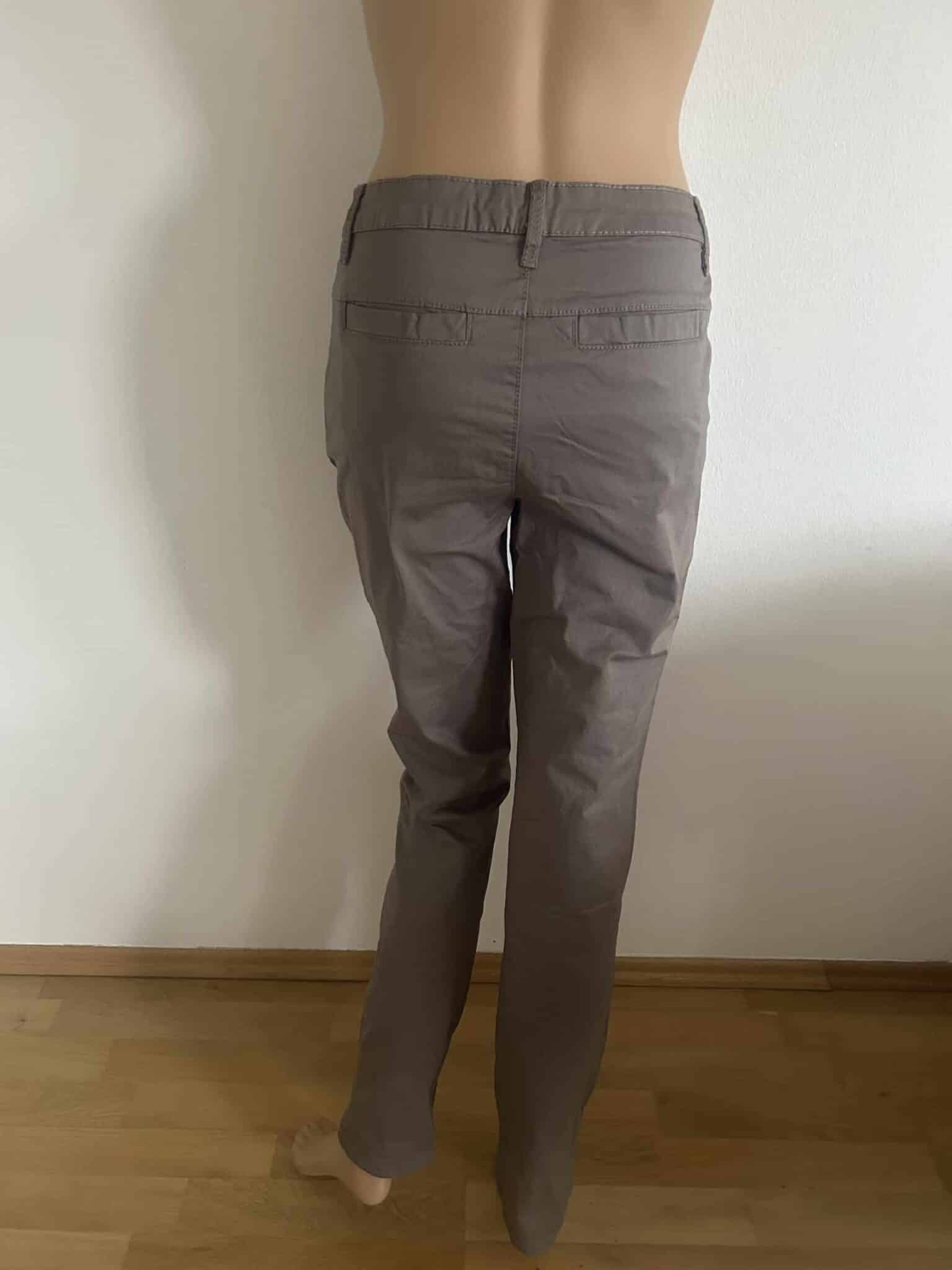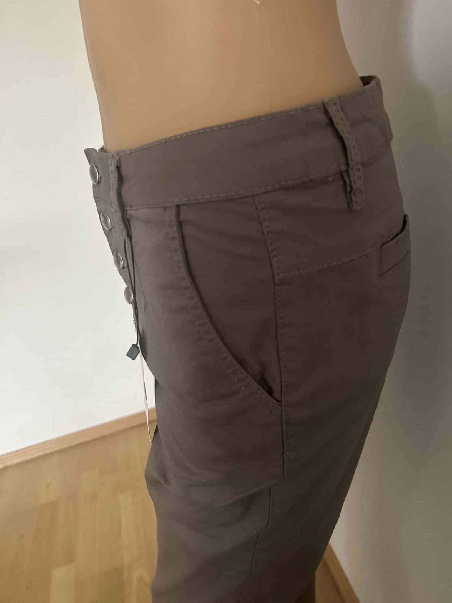 Klassische Form mit angesetztem Bund, Knopfleiste, 2 Eigrifftaschen vorn und 2 Gesäßtaschen.