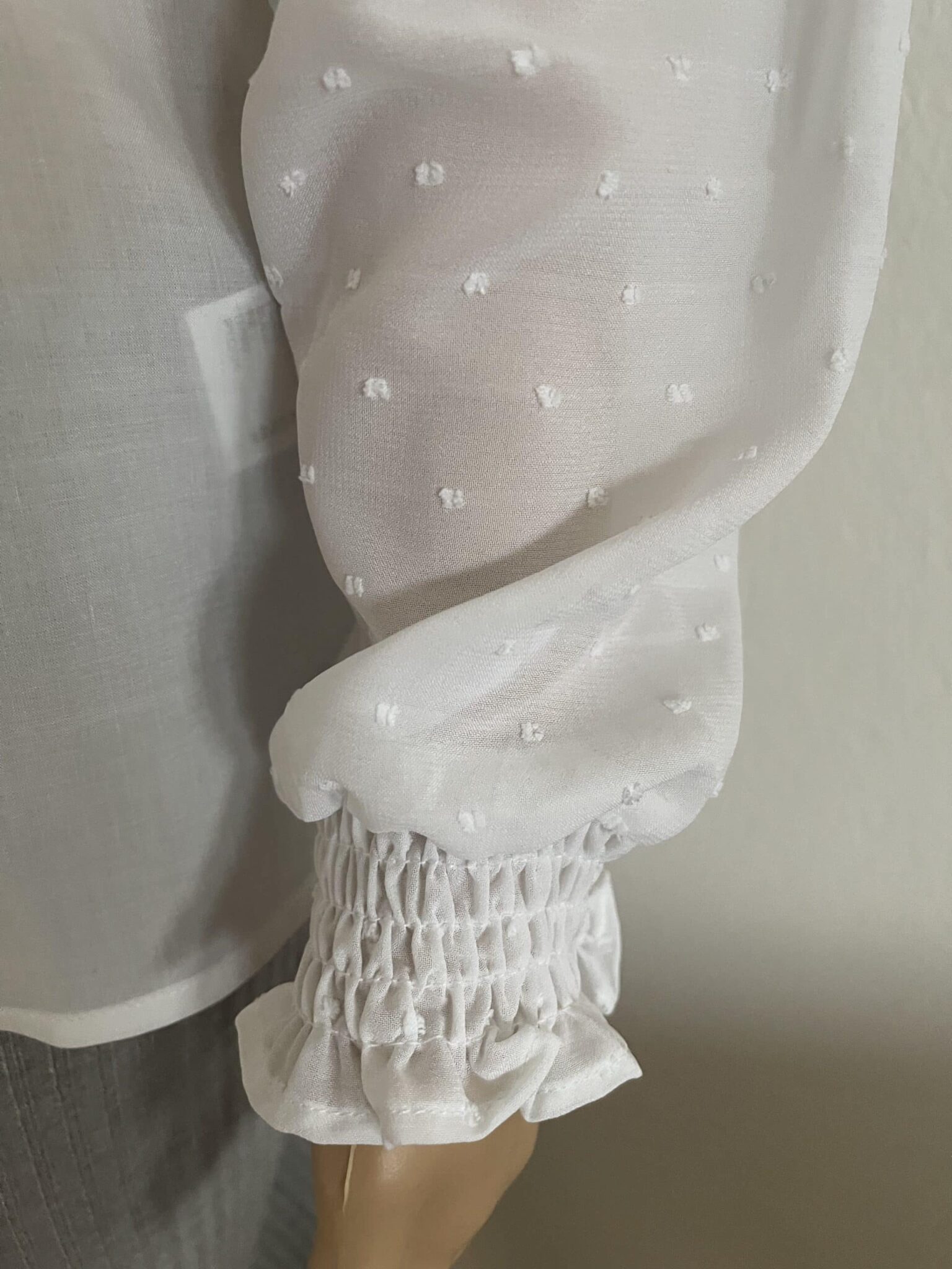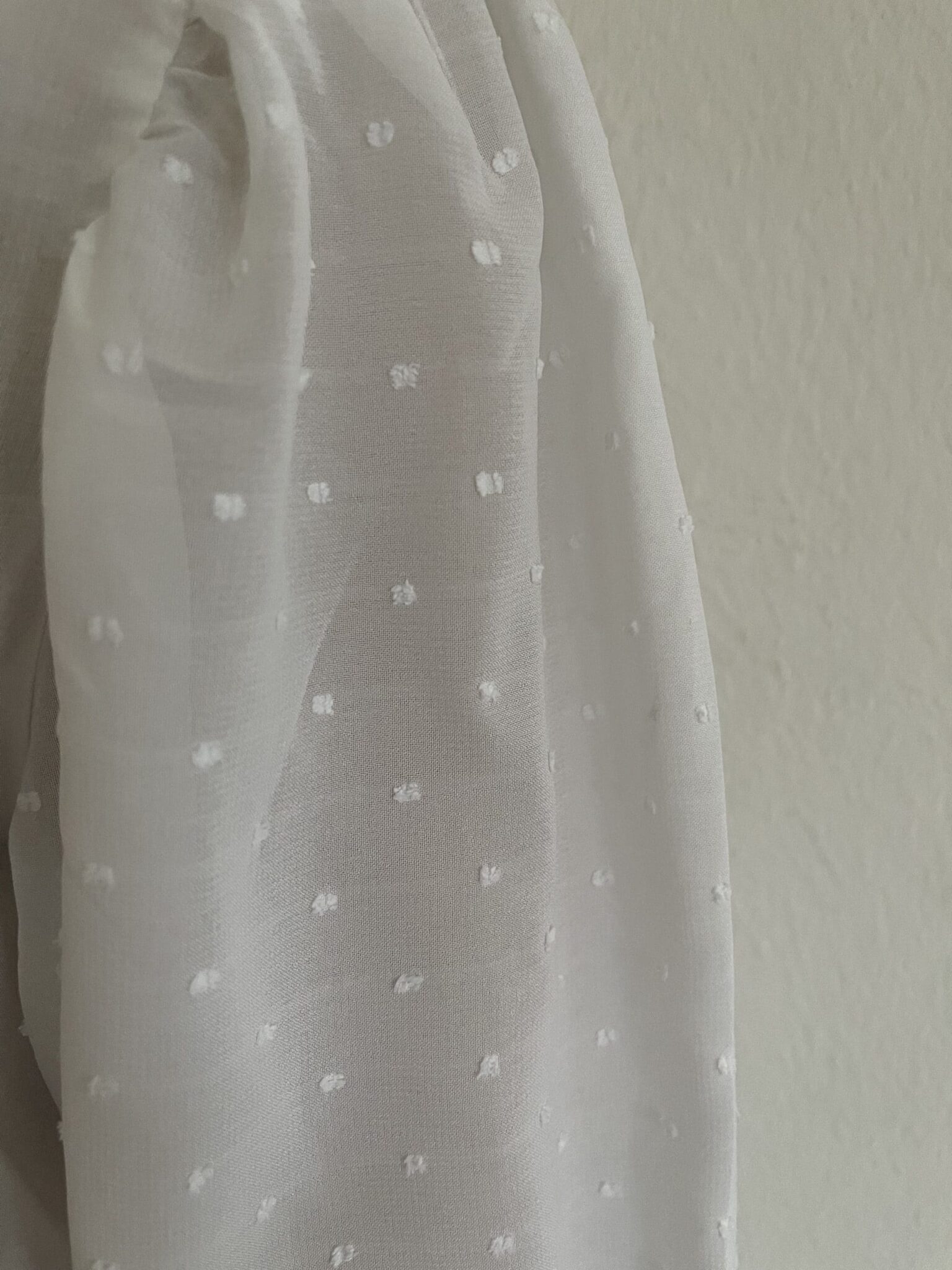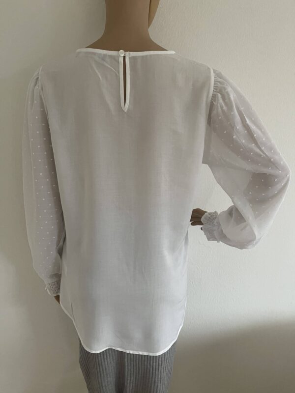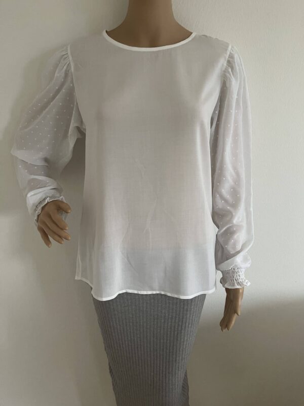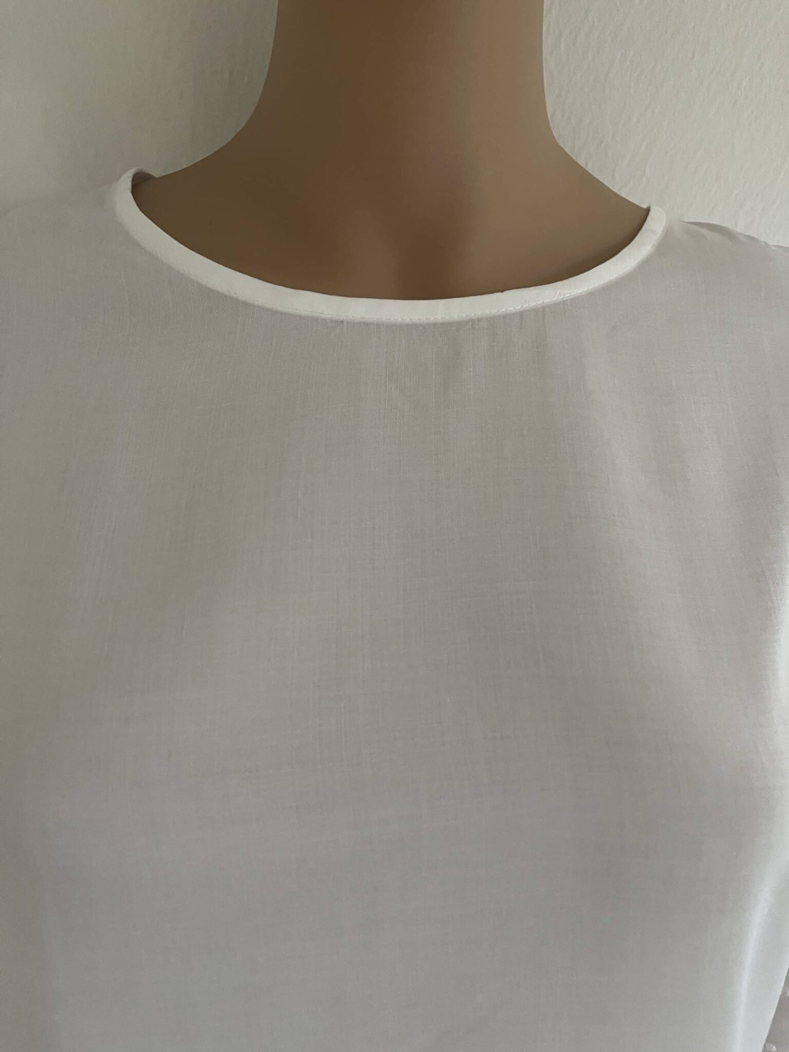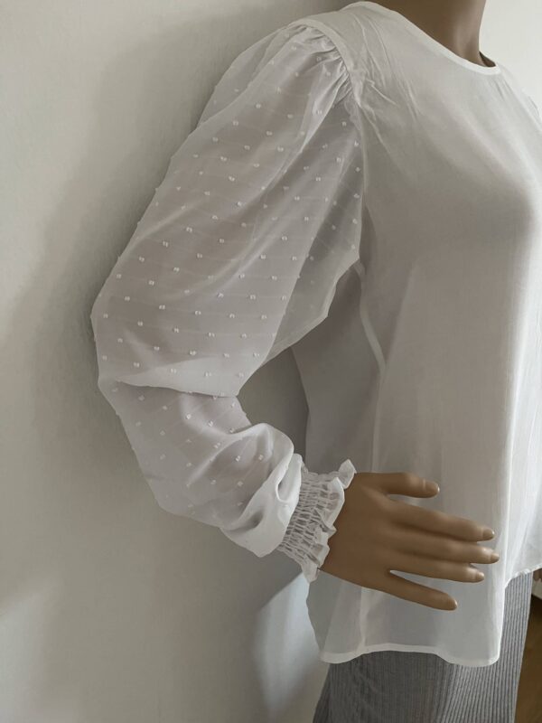 Aus feinem Viskose. Mit 1-Knopf im Nacken zu schließen. Lange Ärmel mit dezenter Punktestickerei und Gummizug am Abschluss. In figurumspielender Passform.