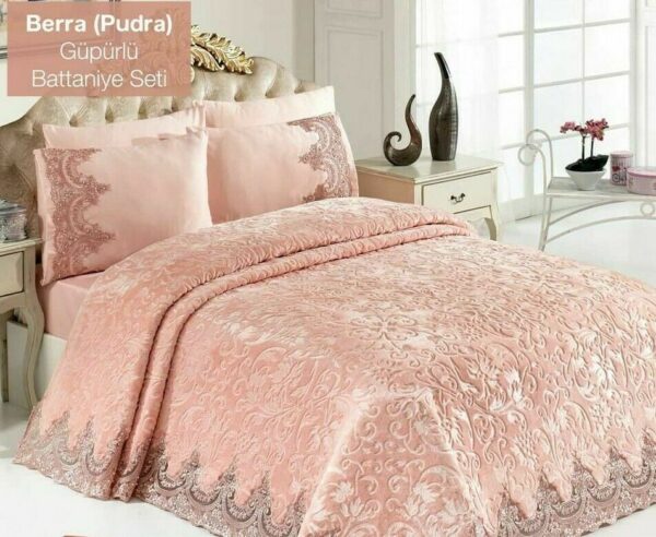 Podobnie jak nasze zestawy pikowane, zestawy kołder Golden Home z francuskiej koronki, wykonane z naciskiem na pastelowe kolory, mają bogate wzornictwo, które jest często wymieniane w sektorze tekstyliów domowych z francuską gipiurą i perłowymi ornamentami na spódnicach. Kołdra jest również dostarczana z bawełnianą satynową pościelą i poszewkami na poduszki.