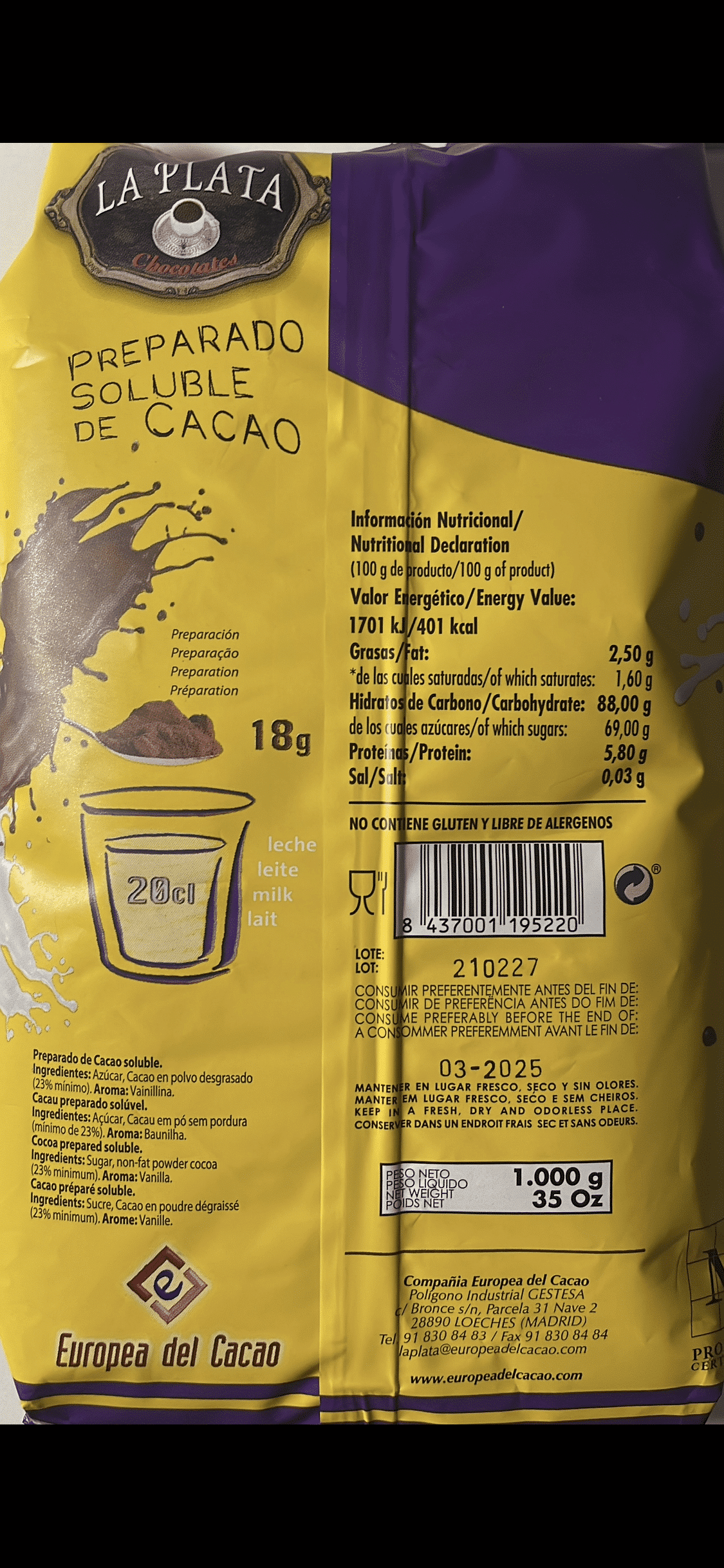 La Plata Löslicher Kakao 1000 g (Spanien), glutenfrei