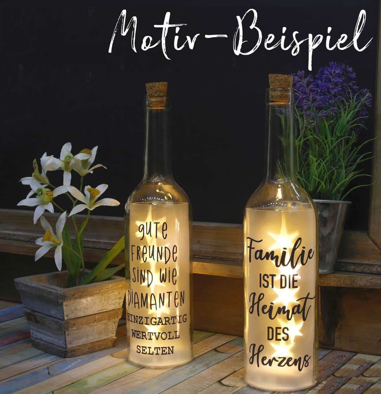 Każda butelka LED jest z miłością drukowana przez nas na miejscu. Nasze niezwykłe motywy i teksty sprawiają, że każda butelka jest wyjątkowa. Czy to dla siebie jako dekoracja, czy jako wspaniały prezent. Świetnie nadaje się również na wesela, zimę, adwent, urodziny, Boże Narodzenie i wiele innych okazji. Jako prezent świąteczny, prezent ślubny lub dekoracja stołu.