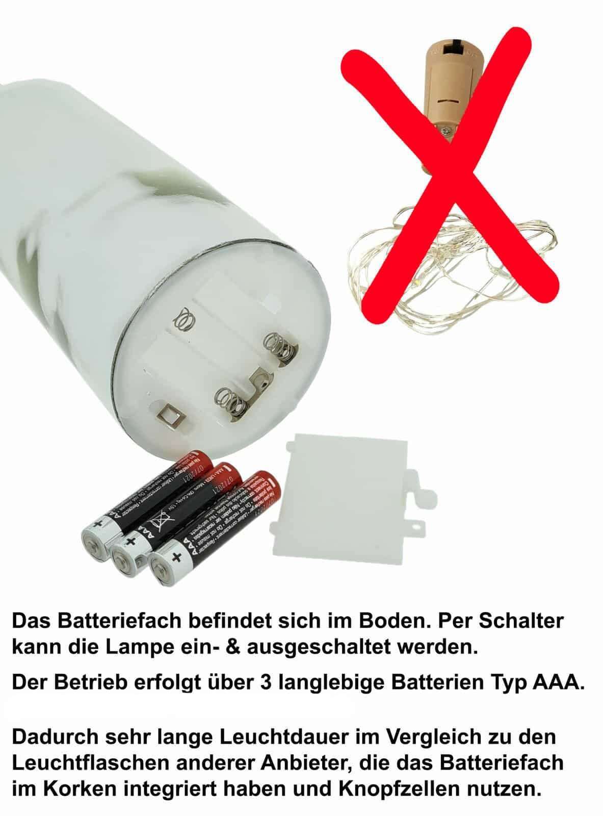 Jako element dekoracyjny lub prezent. Ta podświetlana butelka wygląda po prostu pięknie - nawet gdy jest wyłączona. Baterie i przełącznik są niewidocznie zintegrowane z podstawą butelki. Wystarczy włączyć oświetlenie w razie potrzeby. Podświetlana butelka zużywa bardzo mało energii, więc standardowe baterie wystarczają na długi czas.