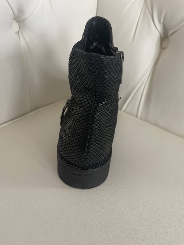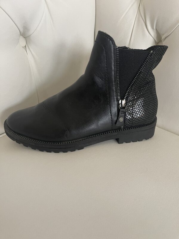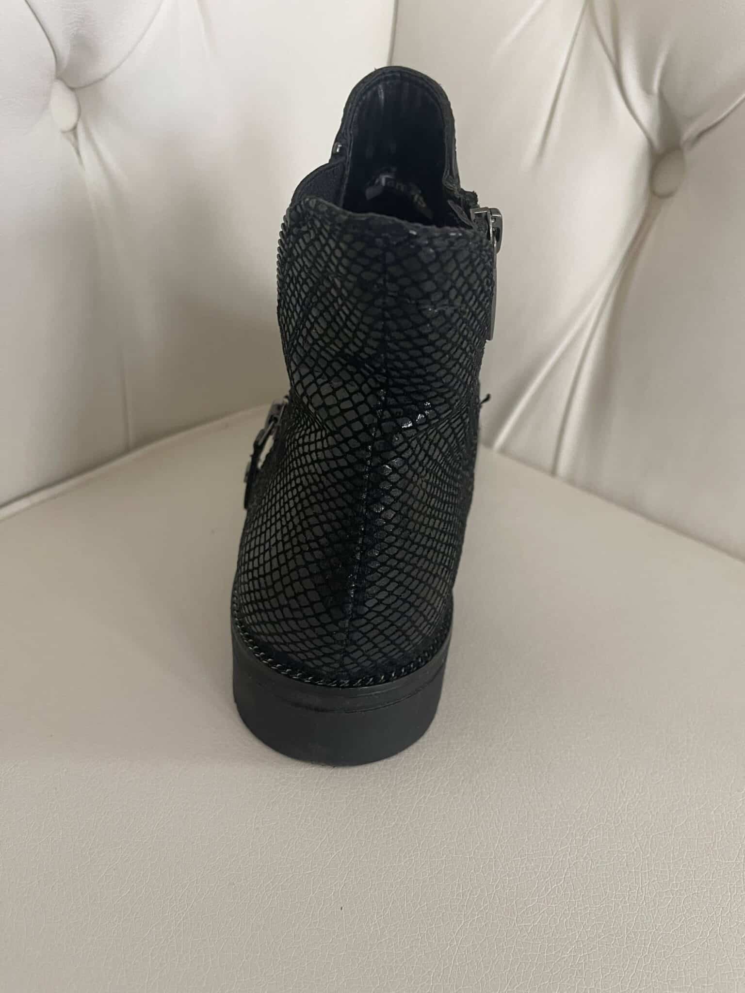 Buty mają zamek błyskawiczny ułatwiający zakładanie i zdejmowanie oraz ozdobny zamek błyskawiczny po przeciwnej stronie.