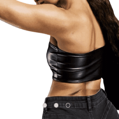 Kombinieren Sie diesen mit einem schwarzen PU-Material mit Bandeau-Ausschnitt und einer kurzen Passform mit einem Midirock aus Kunstleder und kniehohen Stiefeln mit Absatz, um den Look zu vervollständigen.