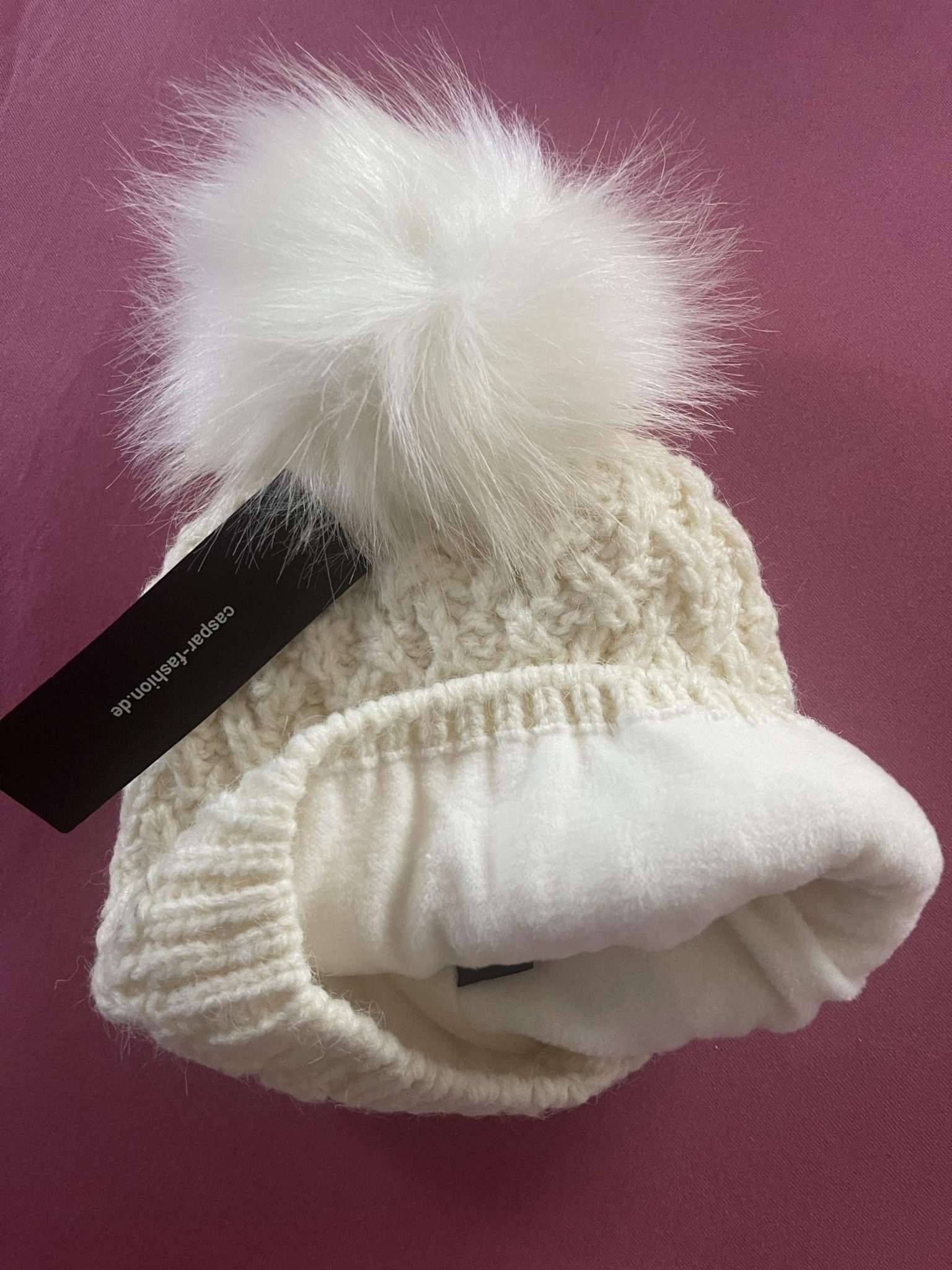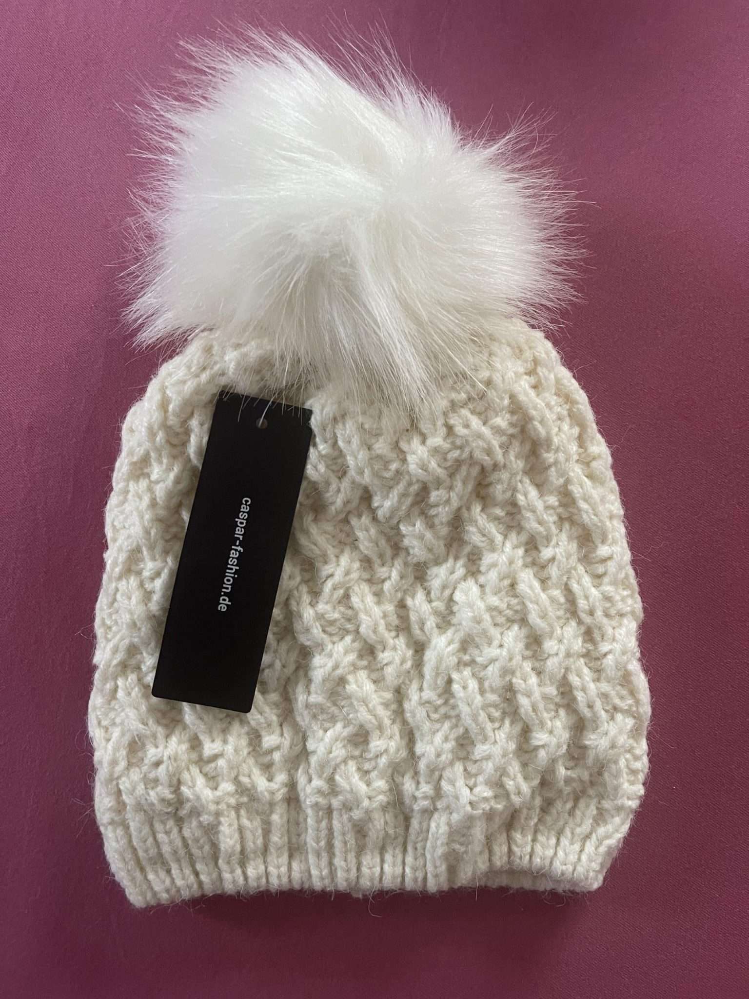 Die Mütze besitzt ein sehr hübsches Strickmuster mit einer hochwertigen und tierschutzgerechten Bommel aus Kunstfell.