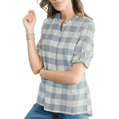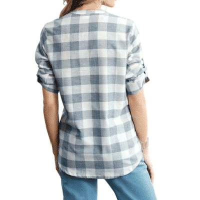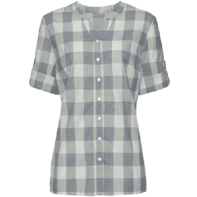 Damen Bluse in Blau-Weiß kariert mit Rundhalsausschnitt u. kleinem V, Gr. 48