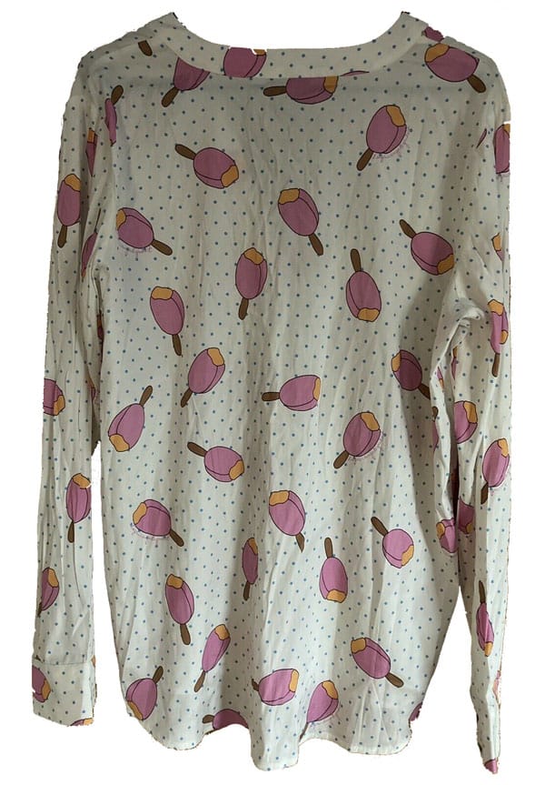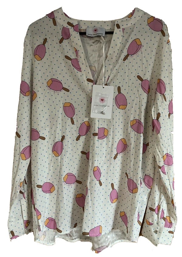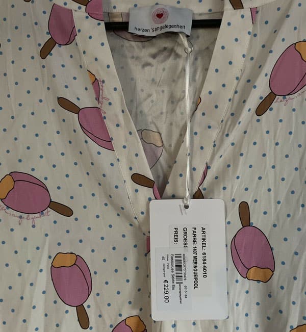 Na dieses Muster ist doch ein süßer Hingucker bei der Seidenbluse vom deutschen Modelabel HERZENSANGELEGENHEIT. Ein blaues Pünktchen Muster und rosafarbenes Eis am Stiel Muster versüßt diese Bluse. Die Seidenbluse hat einen Rundhalsausschnitt, der in einen V-Schlitz übergeht. An den Seitennähten sind Schlitze versehen und das Rückenteil der Bluse ist länger geschnitten. Die Ärmelmanschetten werden mit matt silbernen Perlenknöpfen geschlossen.