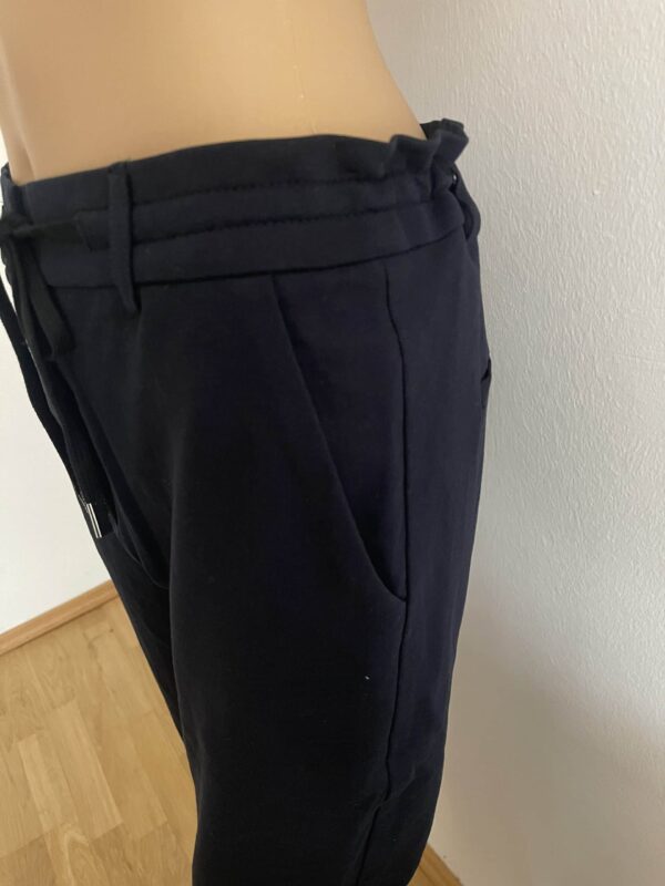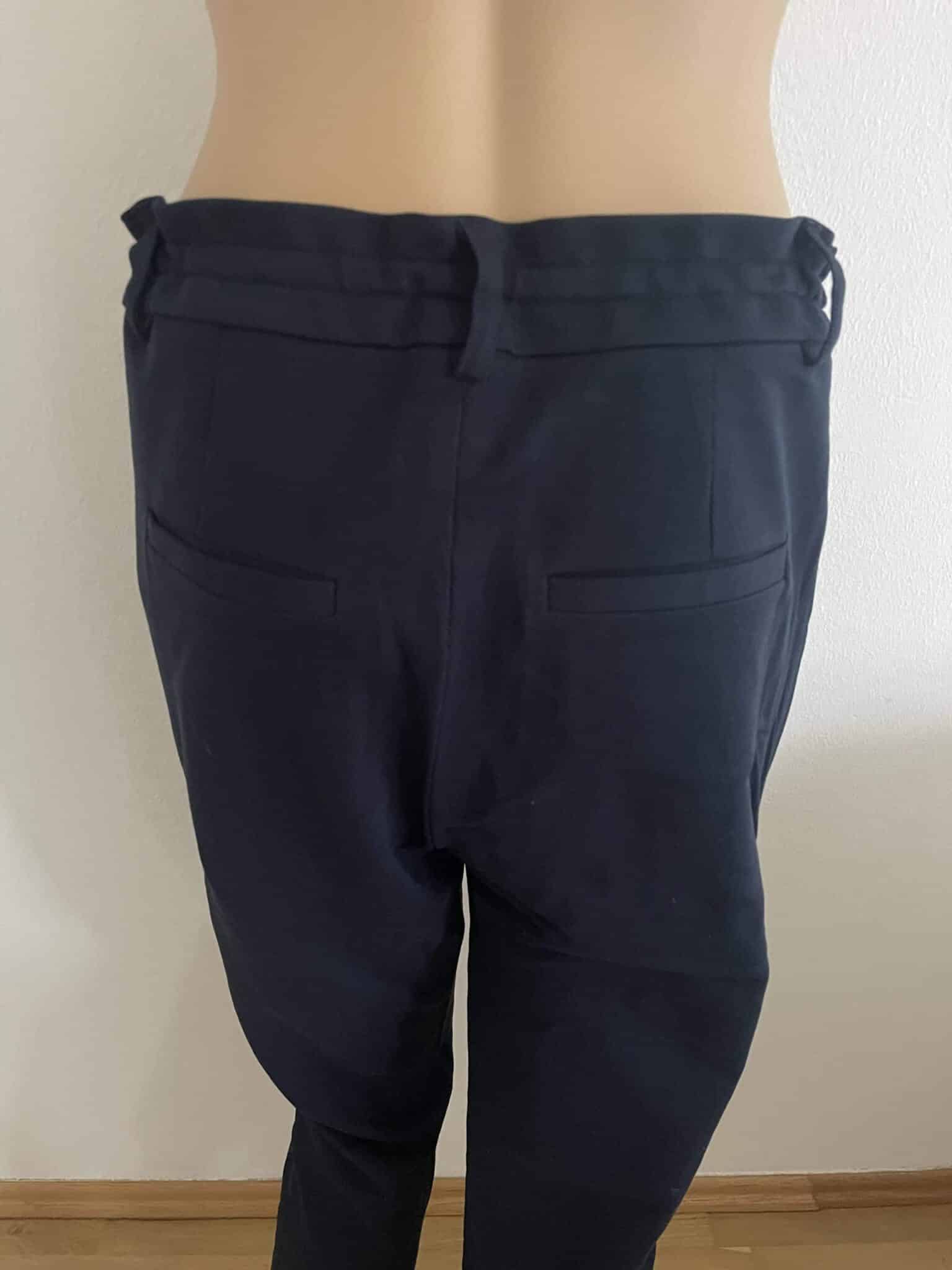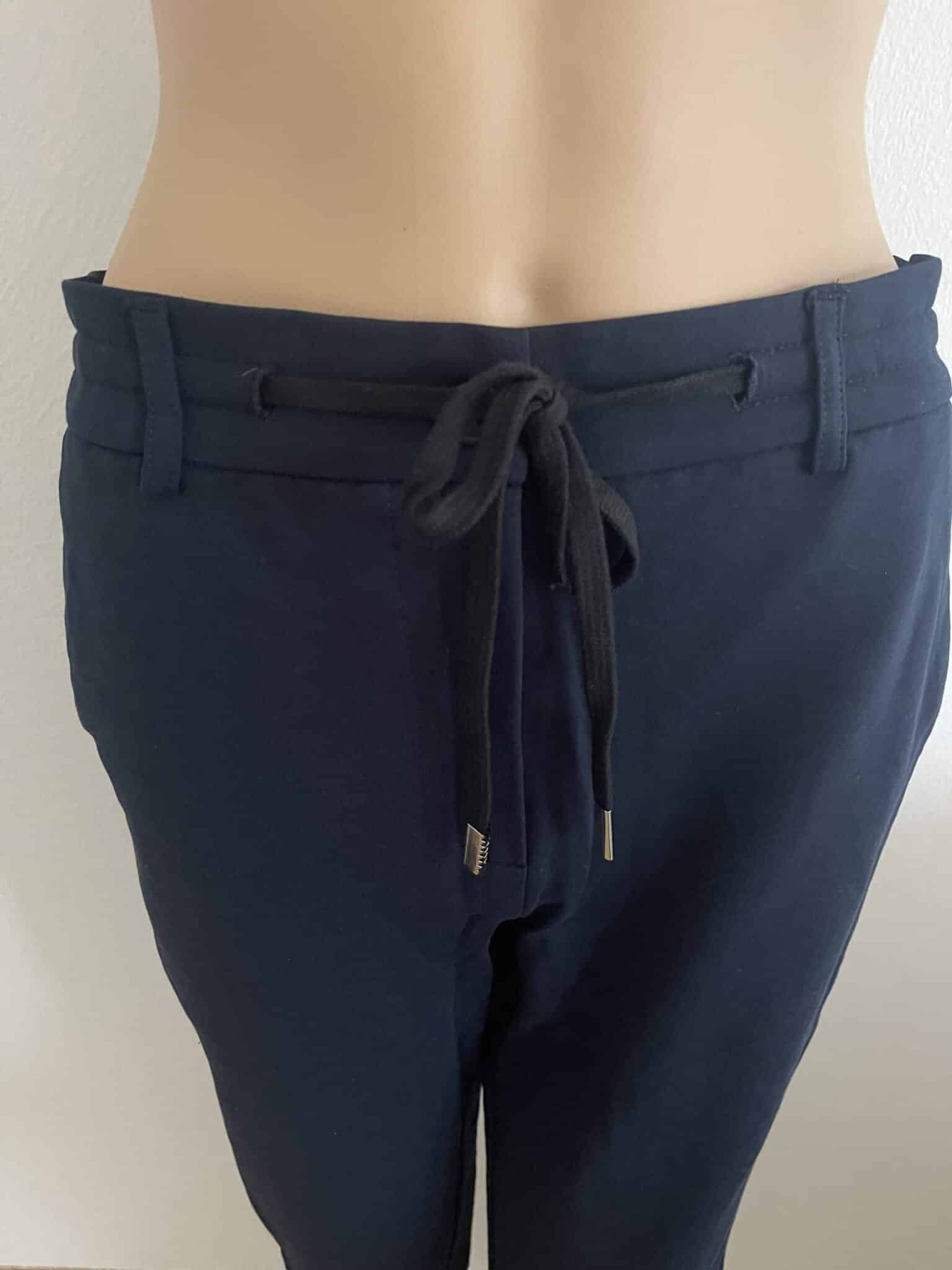 Ein fester Bund mit Knopf und Reißverschluss werden durch ein zusätzliches Bindeband noch unterstützt.