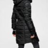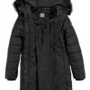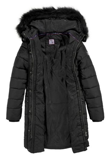 An der Kapuze sitzt eine kuschelige Borte aus Fake Fur und durch variable Tunnelzugbänder lassen sich Kragen und Taille nach Belieben variieren.