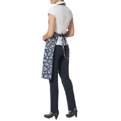 Latzschürze mit durch Druckknöpfe verstellbarem Nackenband und Bindebändern. 2 aufgesetzte Taschen. Einheitsgröße.