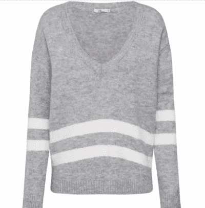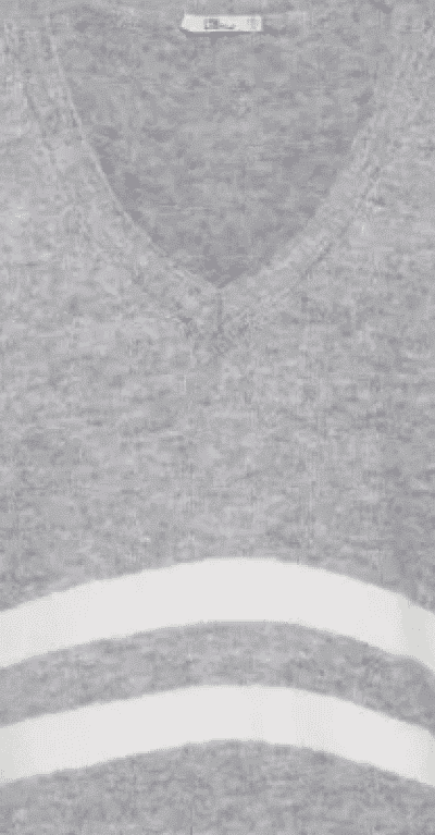 Der V-Ausschnitt weist ein tiefes Dekollete auf, weiterhin gibt es 2 Streifen auf der Vorderseite und den Ärmeln.
