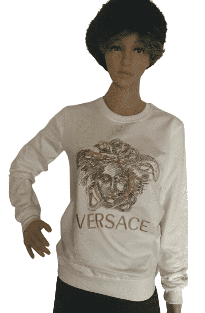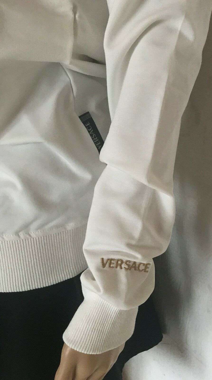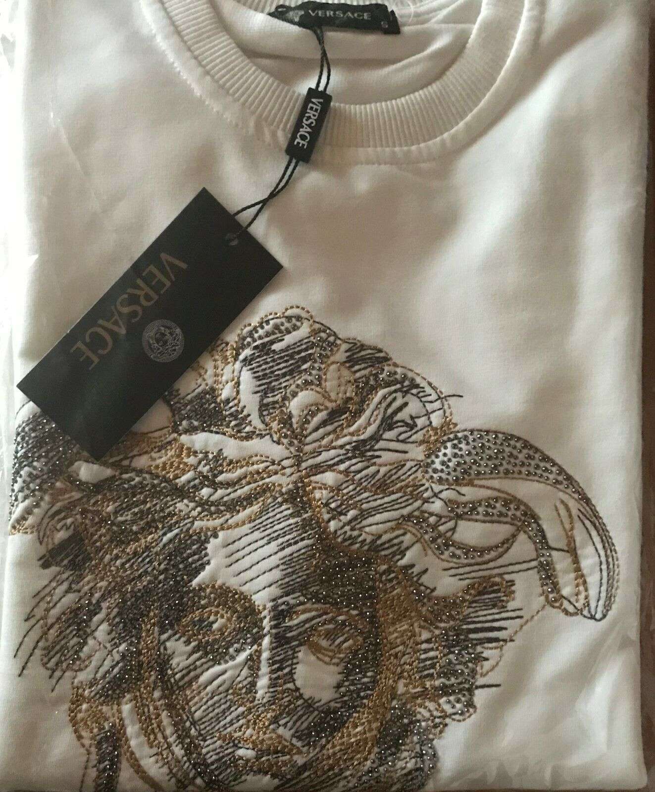 Die Kollektion von Versace erinnert an maximalistisches italienisches Design und opulente Details. Dieses Medusa-Sweatshirt aus schwarzer, gold- und silberfarbener Baumwolle mit Strass verfügt über einen Rundhalsausschnitt, lange Ärmel, einen gerippten Saum und Manschetten, eine Medusa-Logo-Verzierung und eine entspannte Passform.